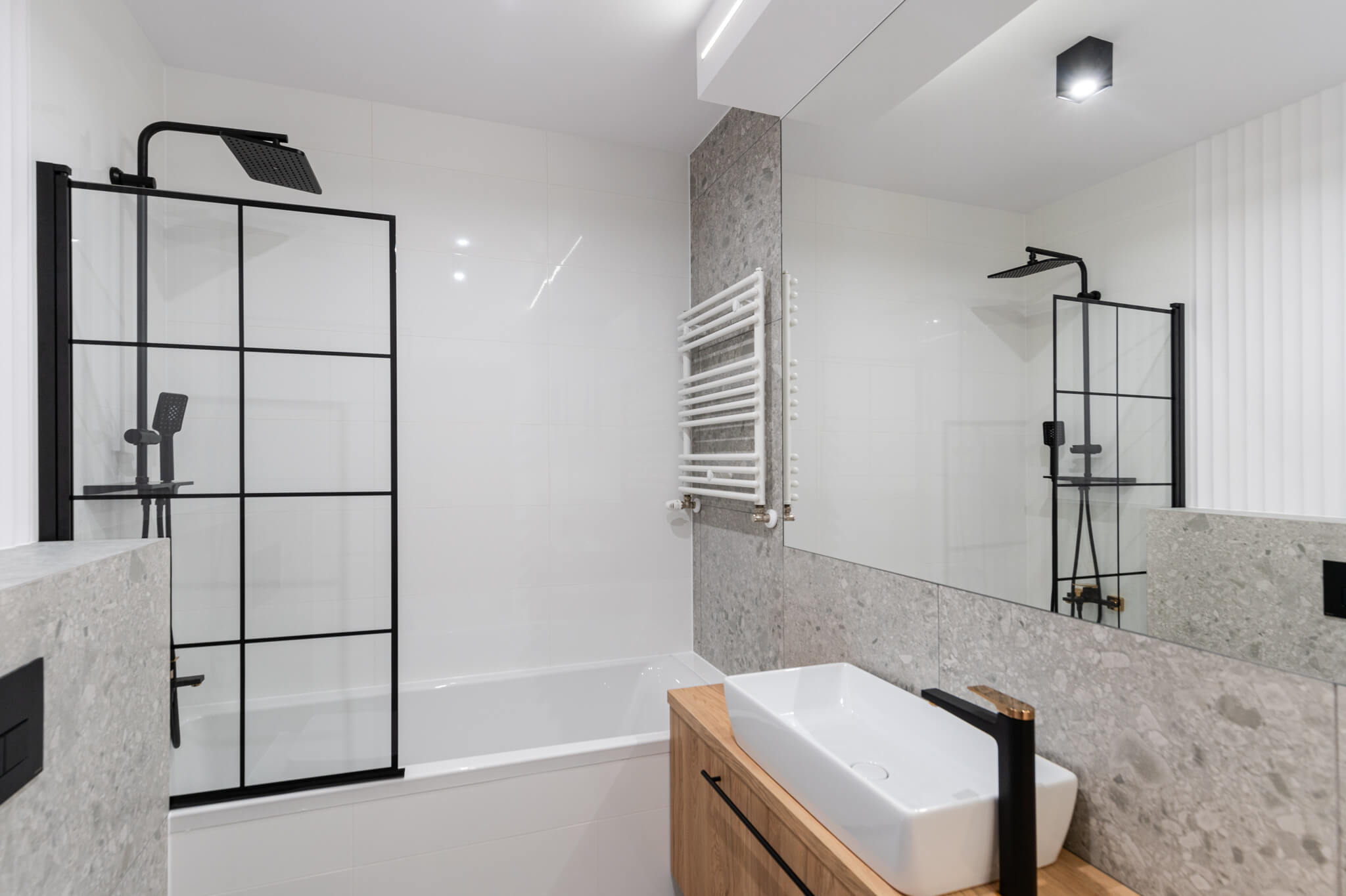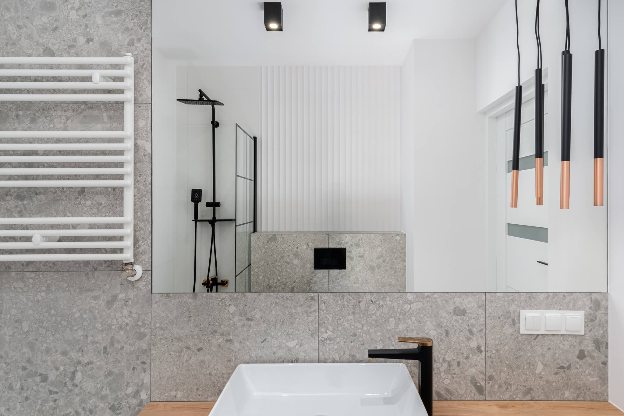 W łazience znalazła się duża wanna z funkcją prysznica i deszczownicą, zabezpieczona szklanym parawanem. Przemyślane rozwiązania, takie jak elegancka umywalka z pojemną szafką oraz duże, geometryczne lustro, dodają wnętrzu głębi i wizualnie je powiększają.