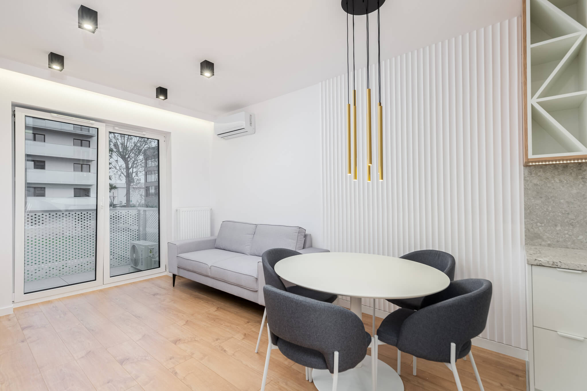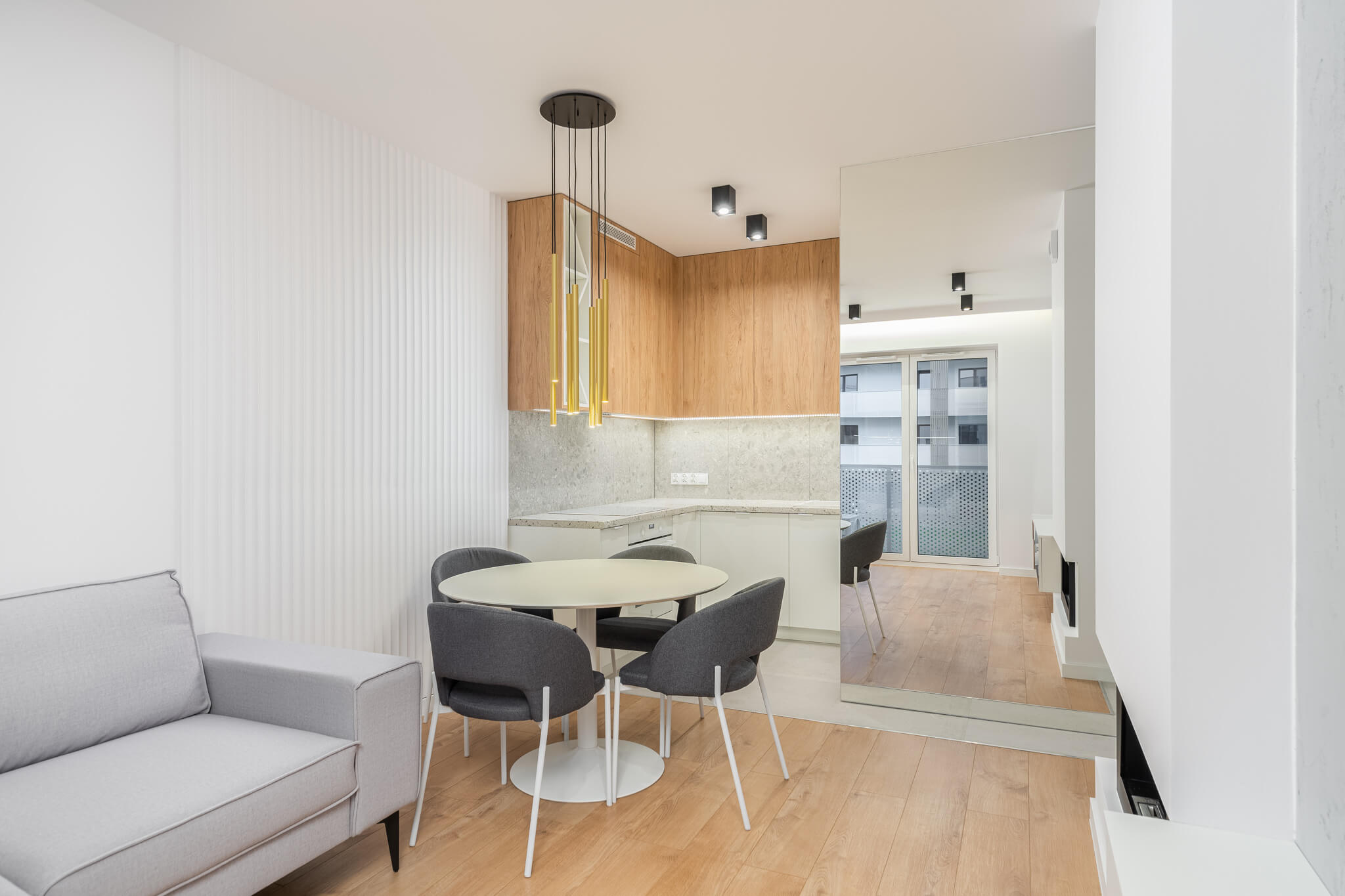 Główną część mieszkania stanowi strefa dzienna z eleganckim salonem połączonym z aneksem kuchennym i jadalnią. Znajduje się tu wygodna sofa, z dekoracyjną ścianką TV wykonaną z betonu architektonicznego, który kontrastuje z przytulnymi dodatkami i ociepla przestrzeń wizualnie. Centralny punkt salonu stanowi stylowy biokominek, który tworzy wyjątkowy nastrój – sprzyjający relaksowi, wieczornym rozmowom czy odpoczynkowi z książką przy naturalnym blasku ognia. Z salonu prowadzi wyjście na balkon o wschodniej ekspozycji – idealne miejsce na filiżankę porannej kawy i rozpoczęcie dnia w otoczeniu zieleni. Centralnie usytuowana jadalnia z dużym oknem to dobrze doświetlona przestrzeń, która sprzyja wspólnym posiłkom. Aneks kuchenny został zaprojektowany z myślą o wygodzie – funkcjonalny blat roboczy, pojemne szafki oraz nowoczesne sprzęty AGD pozwalają cieszyć się codziennym gotowaniem w estetycznym otoczeniu. Na pograniczu salonu i holu znajduje się lustrzana ściana, która odbija naturalne światło oraz widok z okna, optycznie powiększając przestrzeń i wzmacniając poczucie lekkości wnętrza.