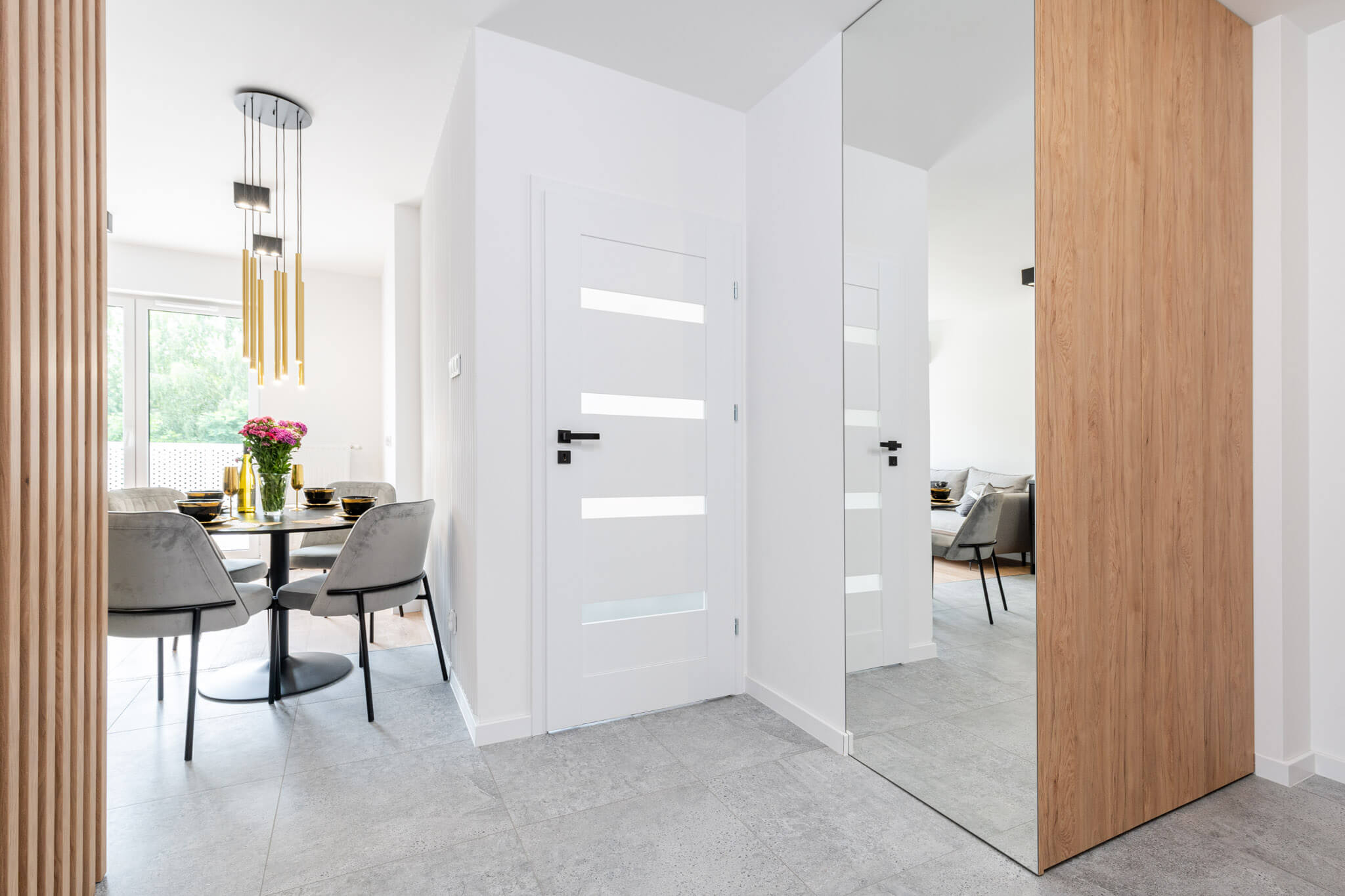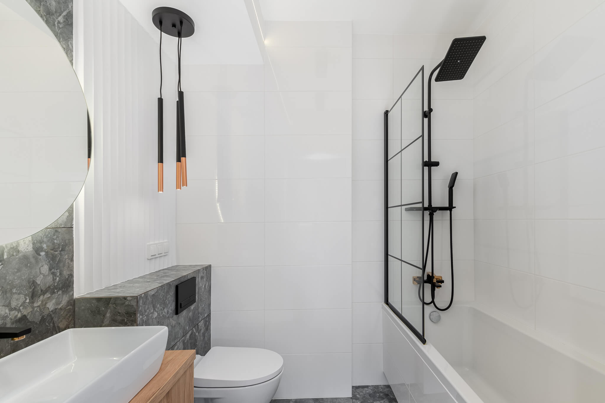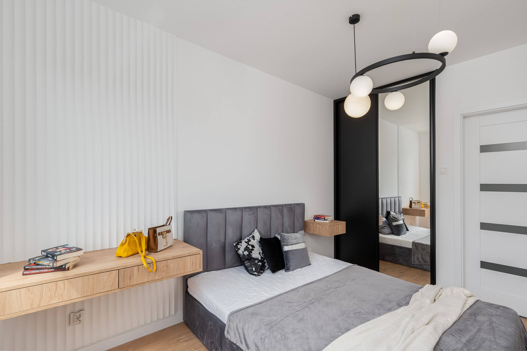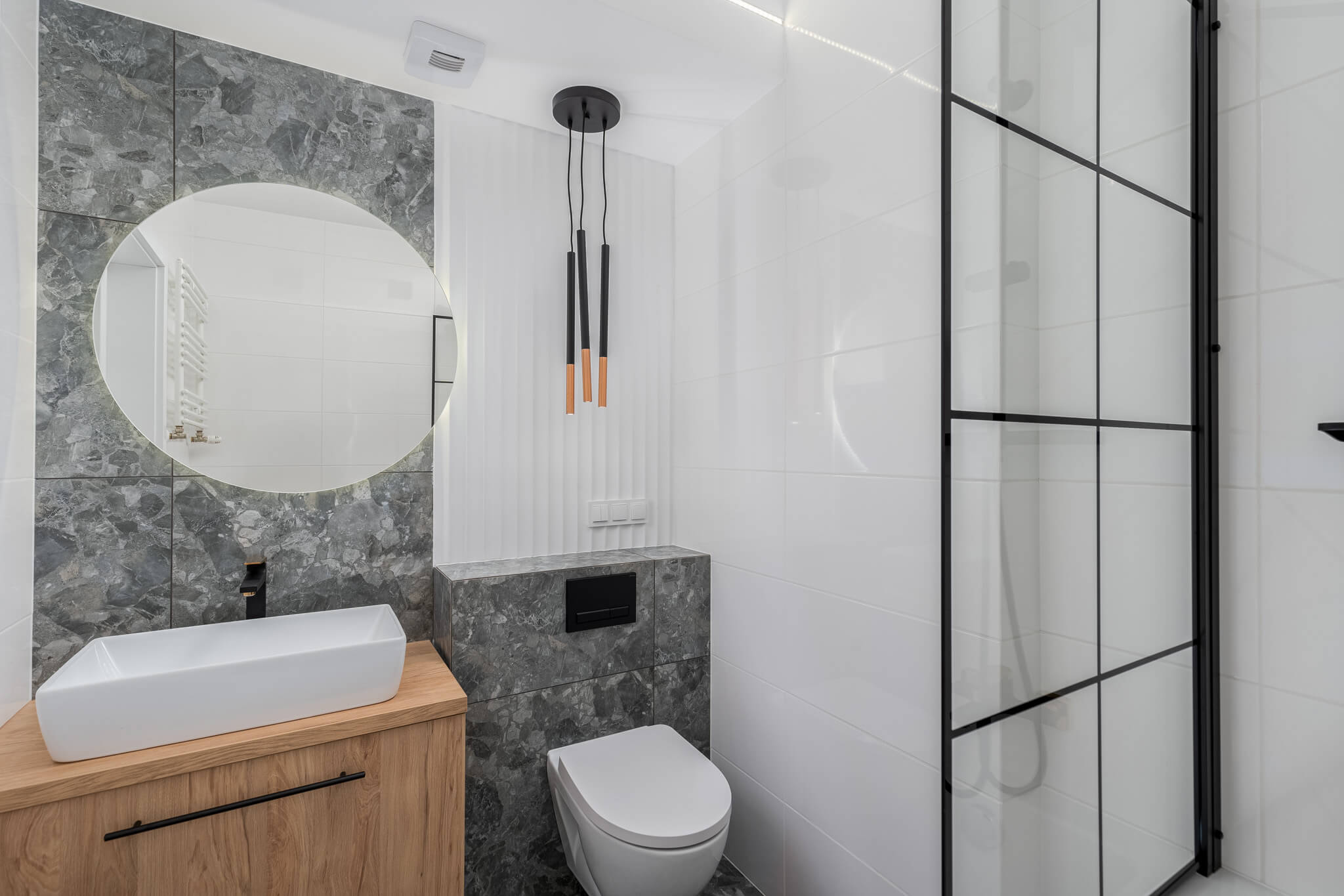 Wnętrze zostało zaplanowane z myślą o maksymalnej funkcjonalności i komforcie codziennego użytkowania. Dominują tu jasne, naturalne barwy i zróżnicowane faktury – zestawienie bieli i jasnego drewna przełamane zostało matową czernią, dekorami o strukturze ciemnego kamienia oraz subtelnymi złotymi akcentami. Całość dopełniają oryginalne detale: industrialne lampy, metalowe uchwyty i podświetlane, geometryczne lustra, które wspólnie tworzą harmonijną przestrzeń w nowoczesnym stylu z nutą loftowego charakteru.