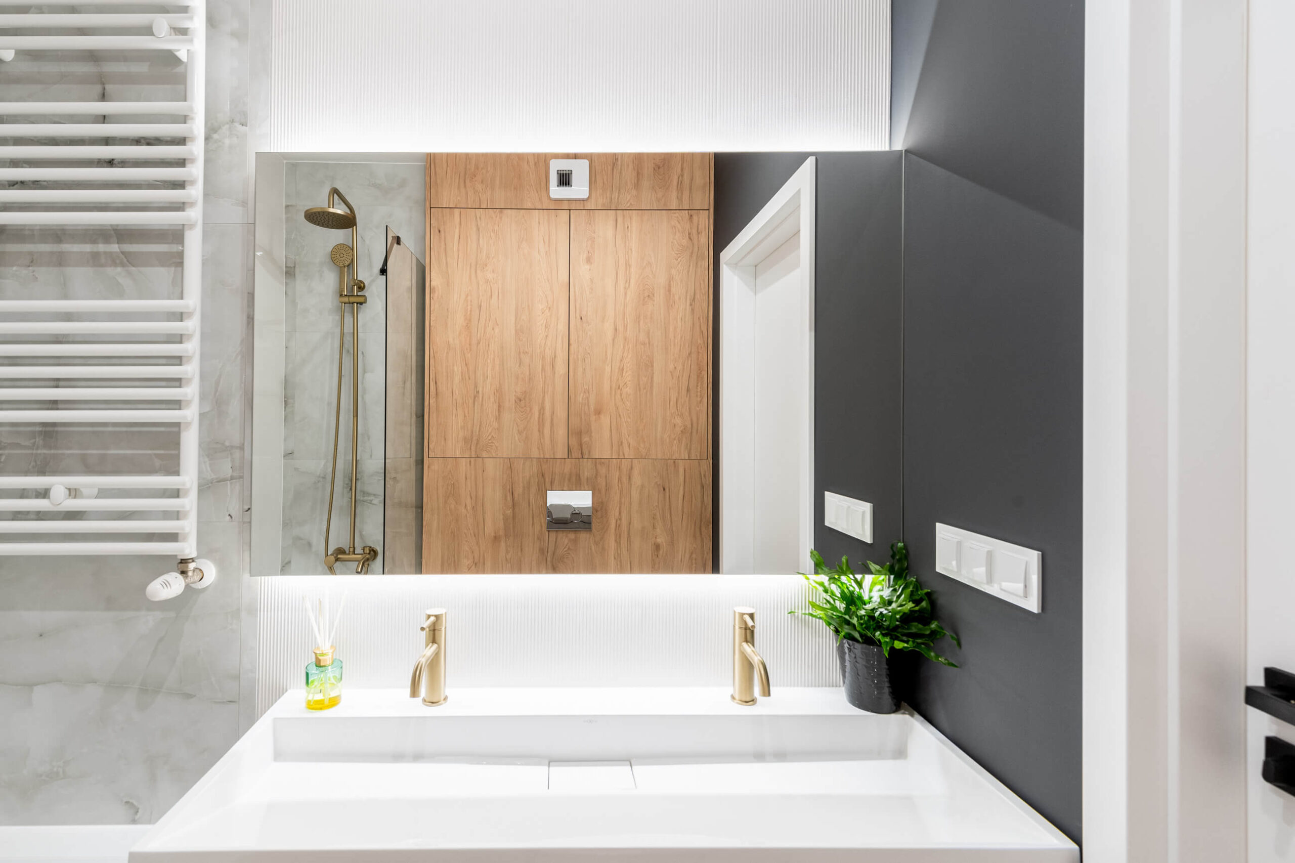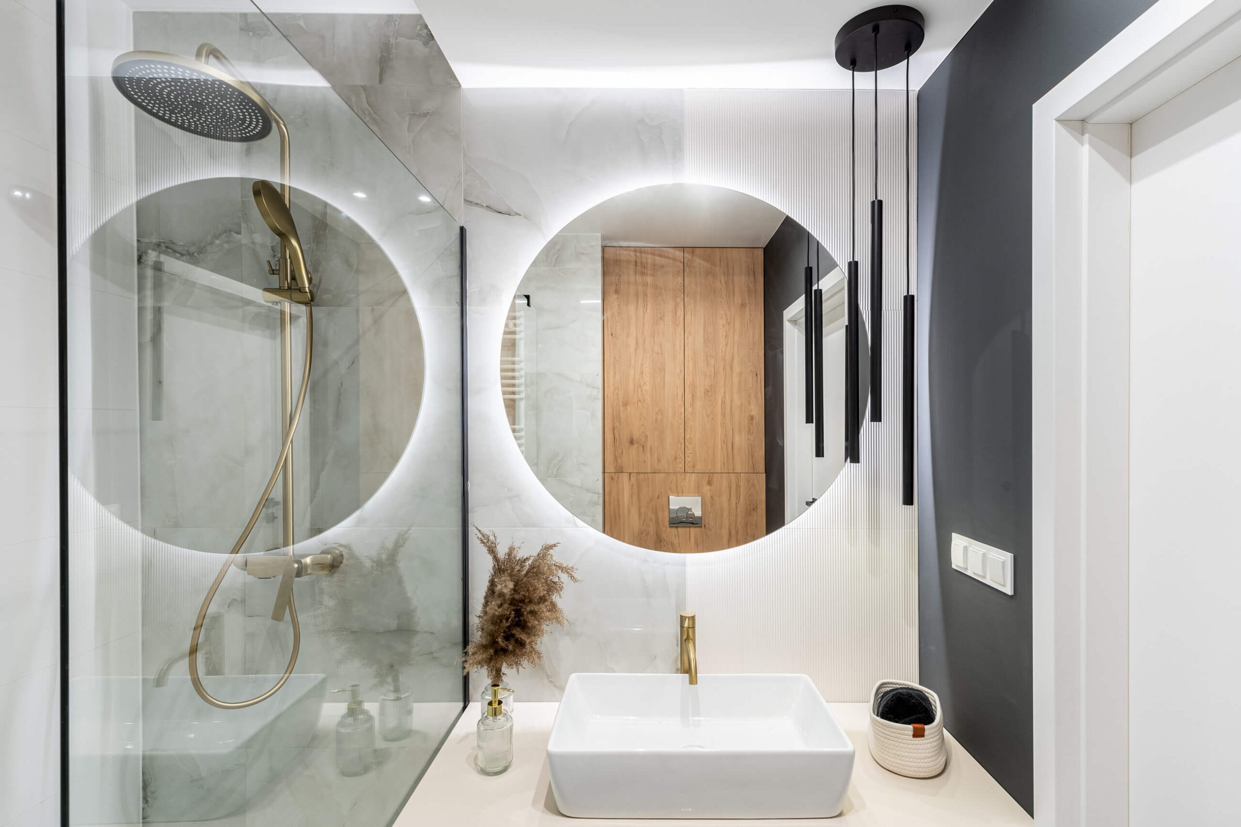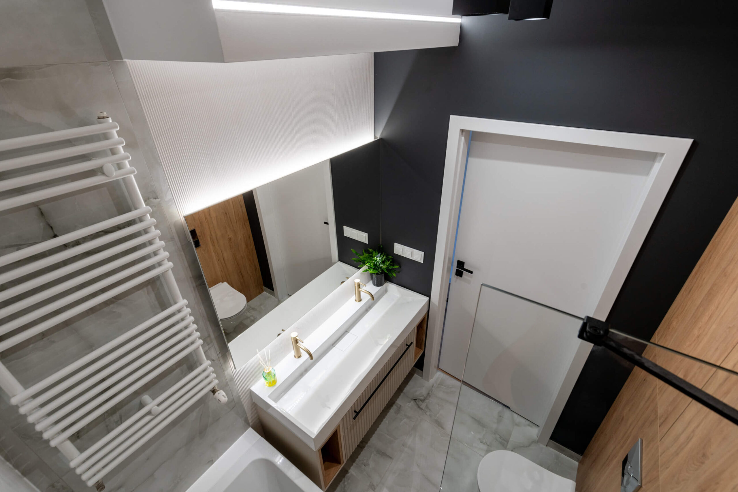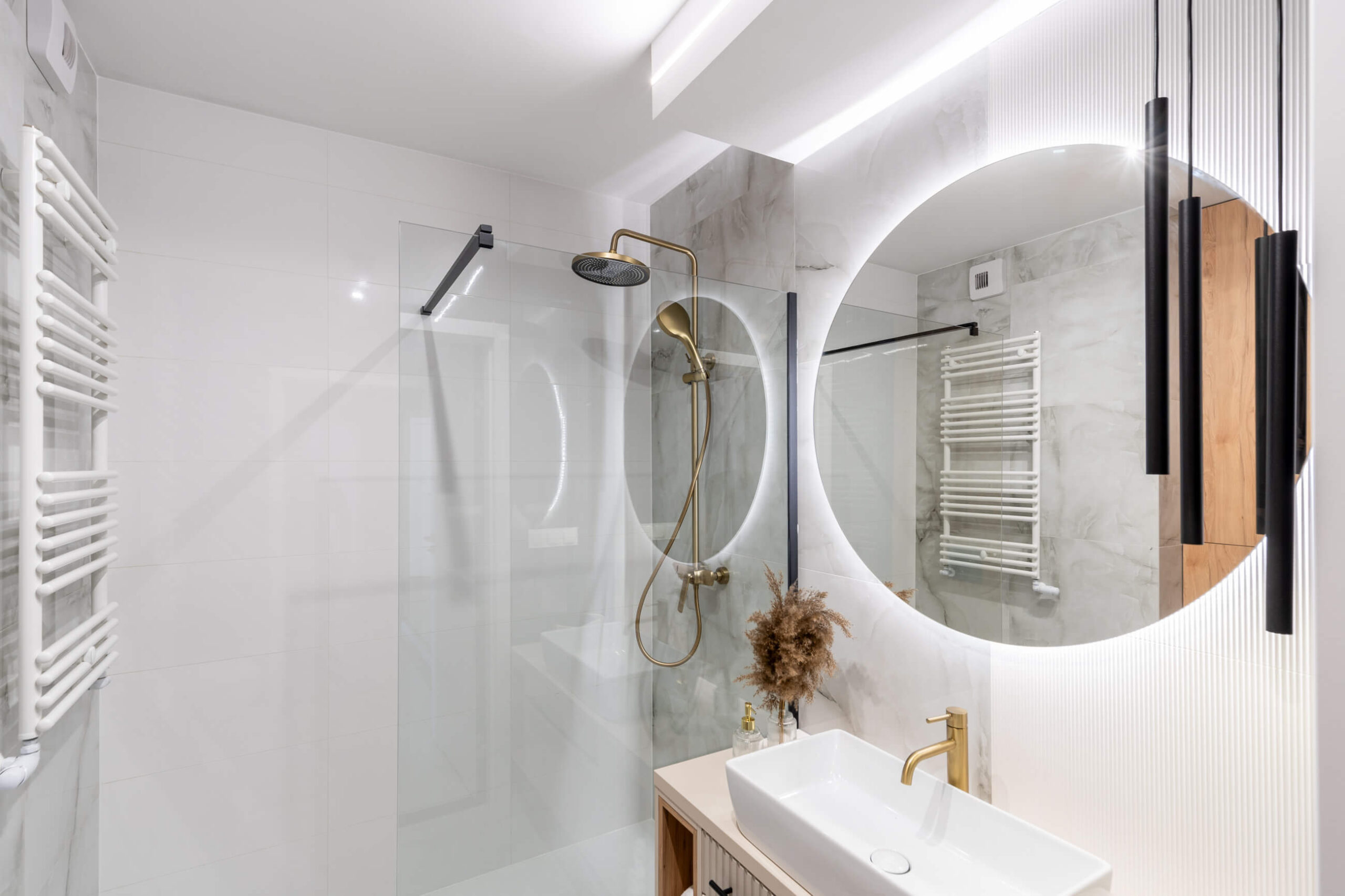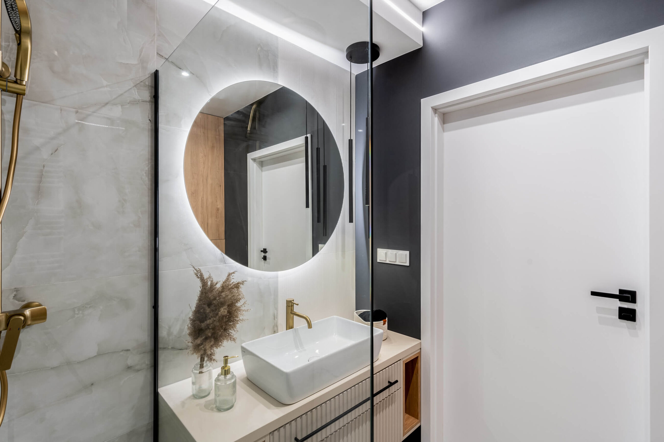 Łazienka główna została zaprojektowana z dbałością o detale – znajdziemy tu przestronny prysznic z deszczownicą i szklanym parawanem, wygodną umywalkę z pojemną szafką oraz duże geometryczne lustro z podświetleniem LED, które nie tylko spełnia funkcję użytkową, ale też optycznie powiększa przestrzeń.