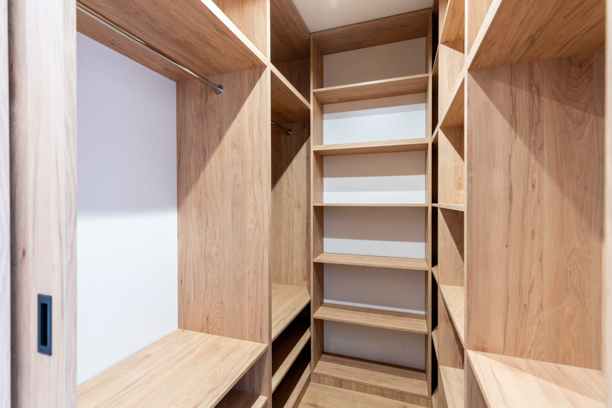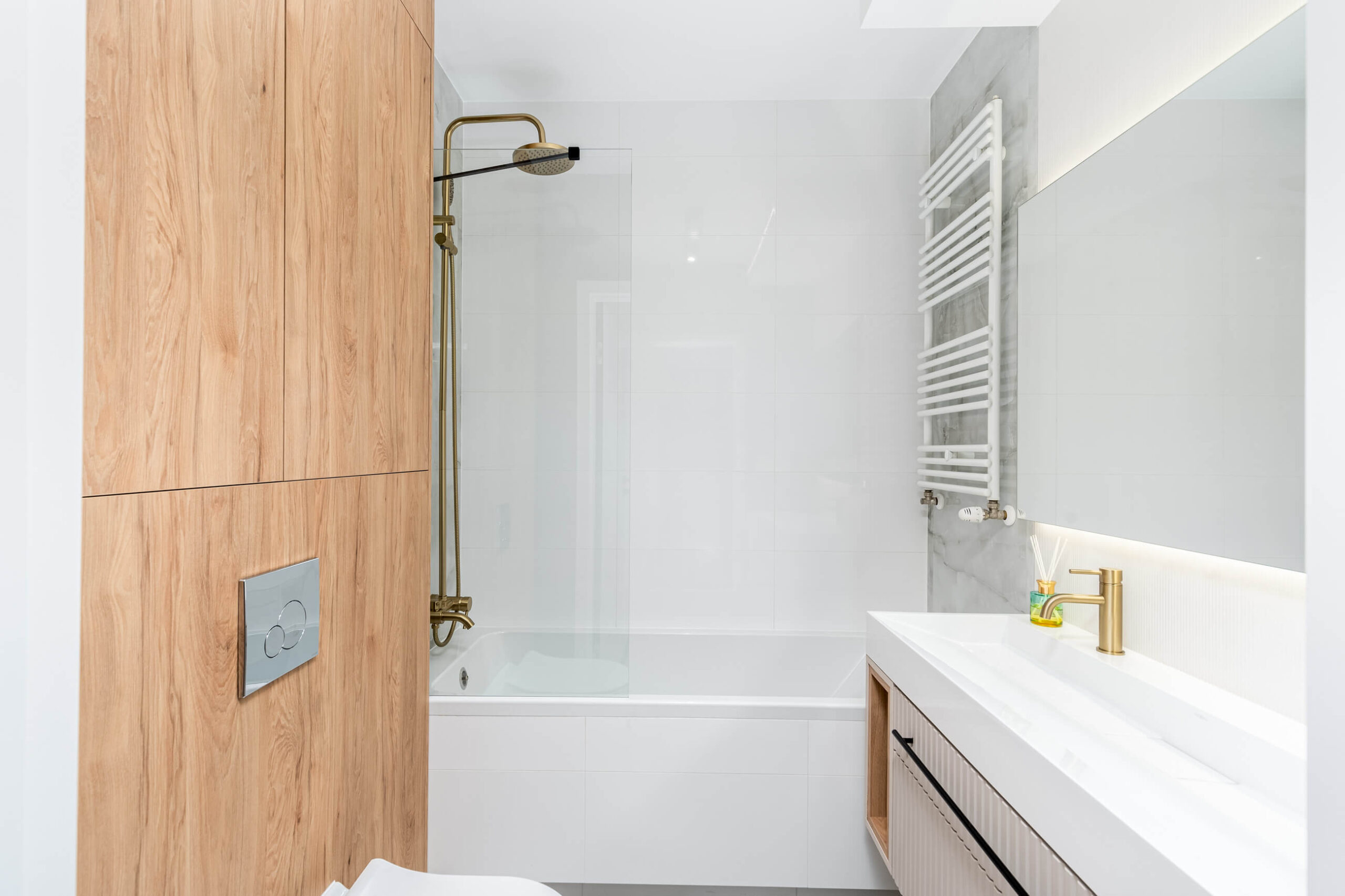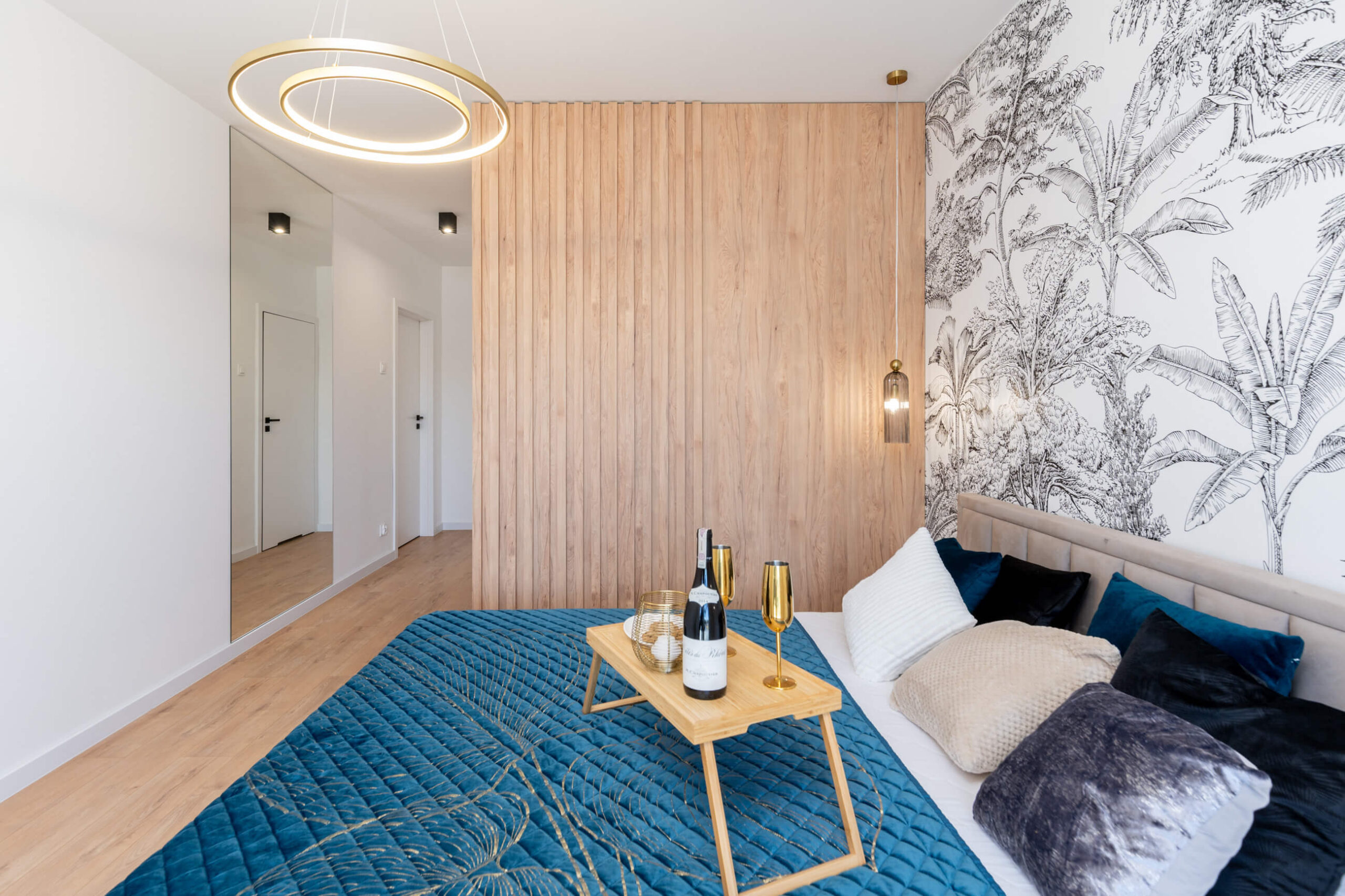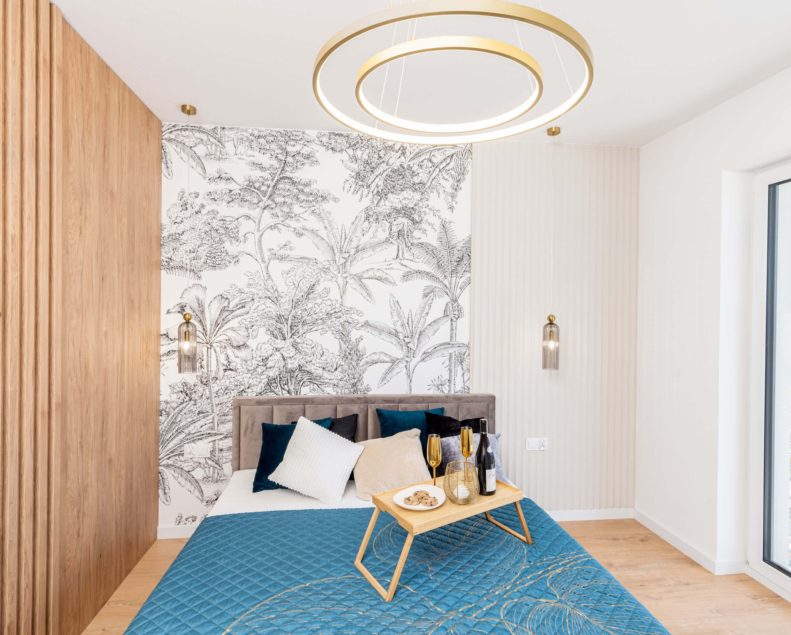 Mieszkanie zostało zaprojektowane w nowoczesnym stylu z wyraźnymi wpływami estetyki japandi – połączenia japońskiego minimalizmu z nordyckim ciepłem. Dominują tu białe i kaszmirowe powierzchnie, jasne drewno, płytki o subtelnym kamiennym wykończeniu, a także czarne i złote detale, które nadają wnętrzu elegancji i wyrazistości. Styl ten podkreślają również roślinne motywy tapet, wprowadzające spokój i harmonię.