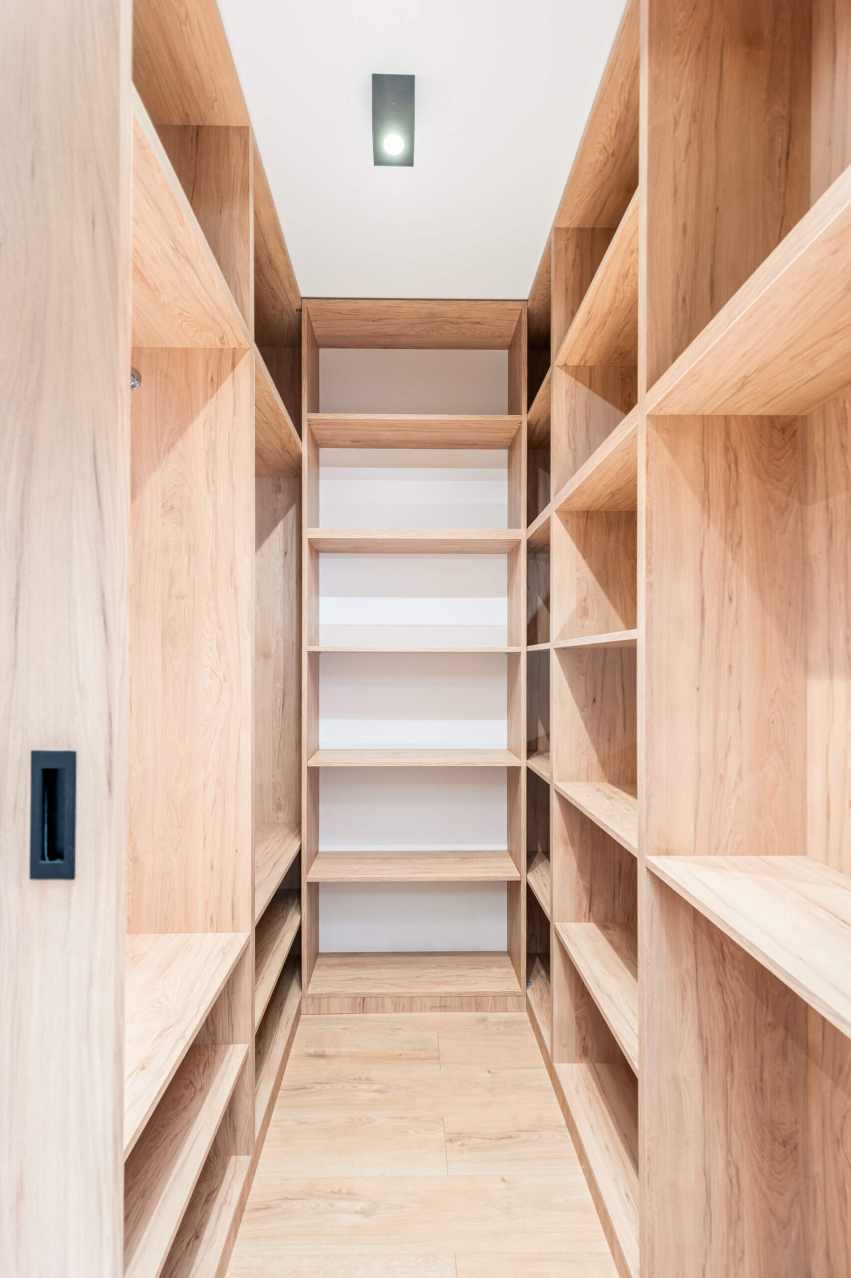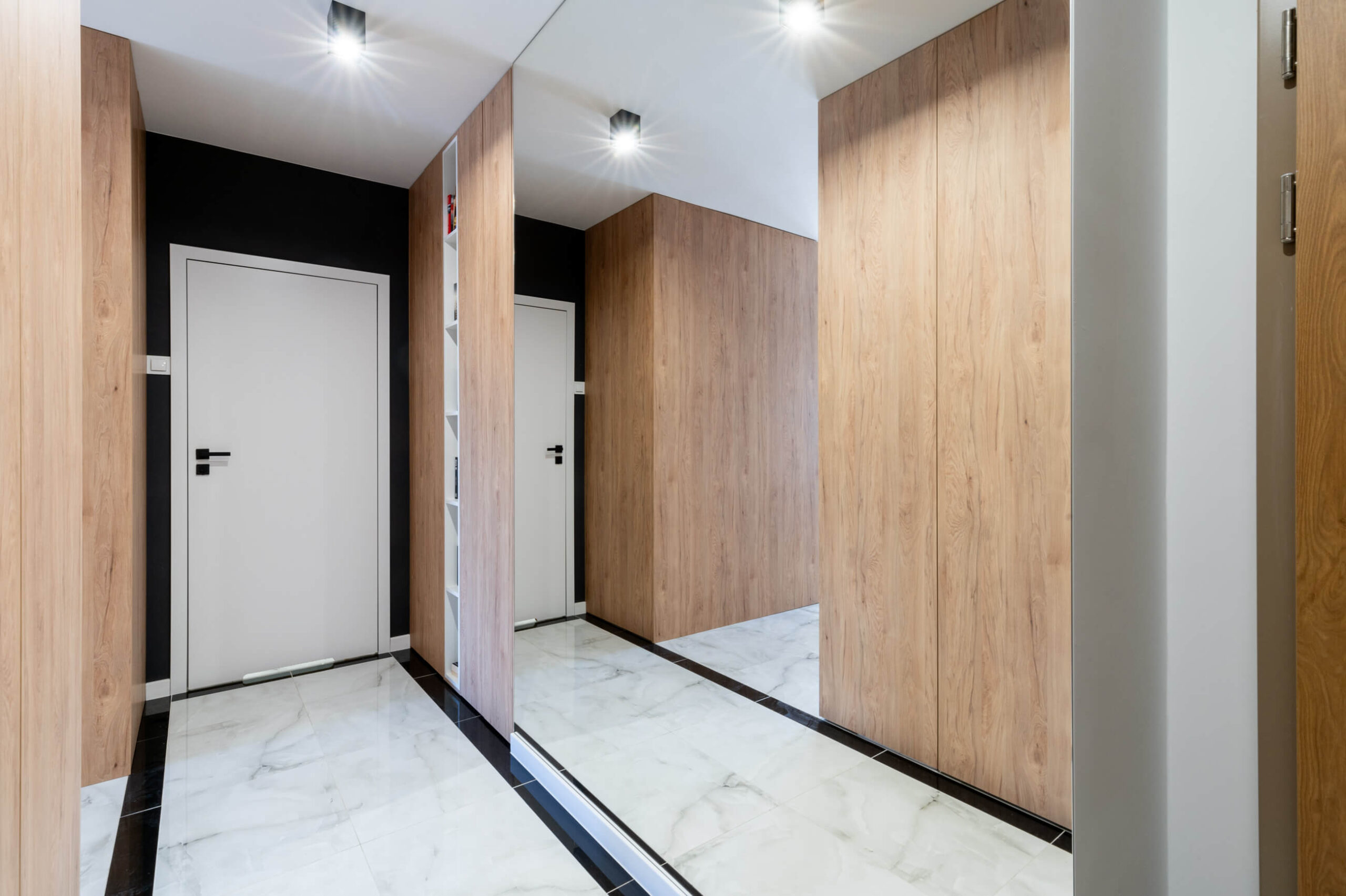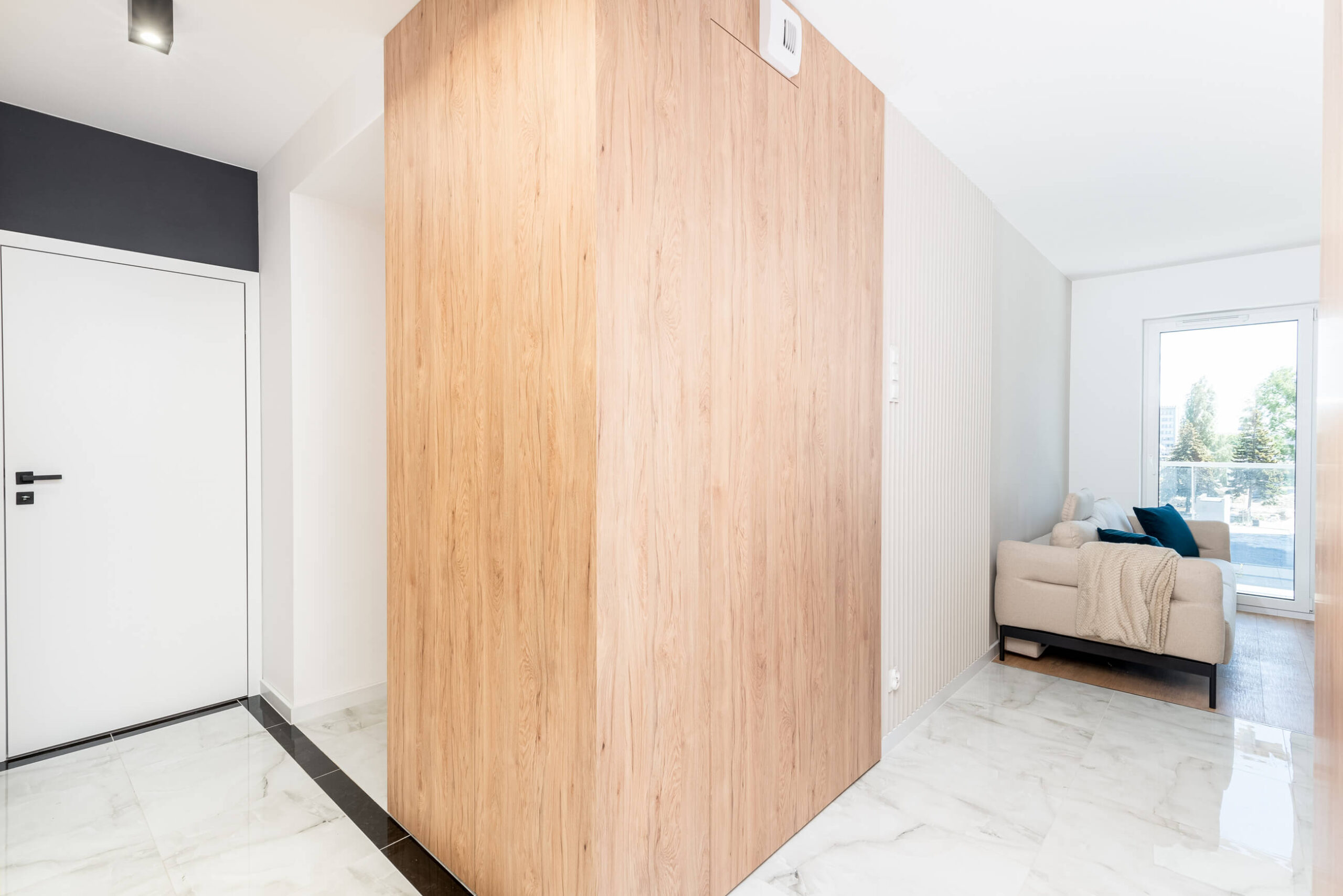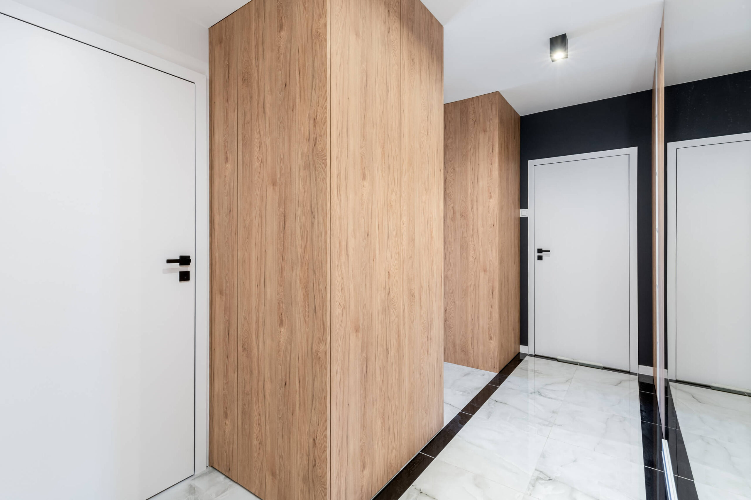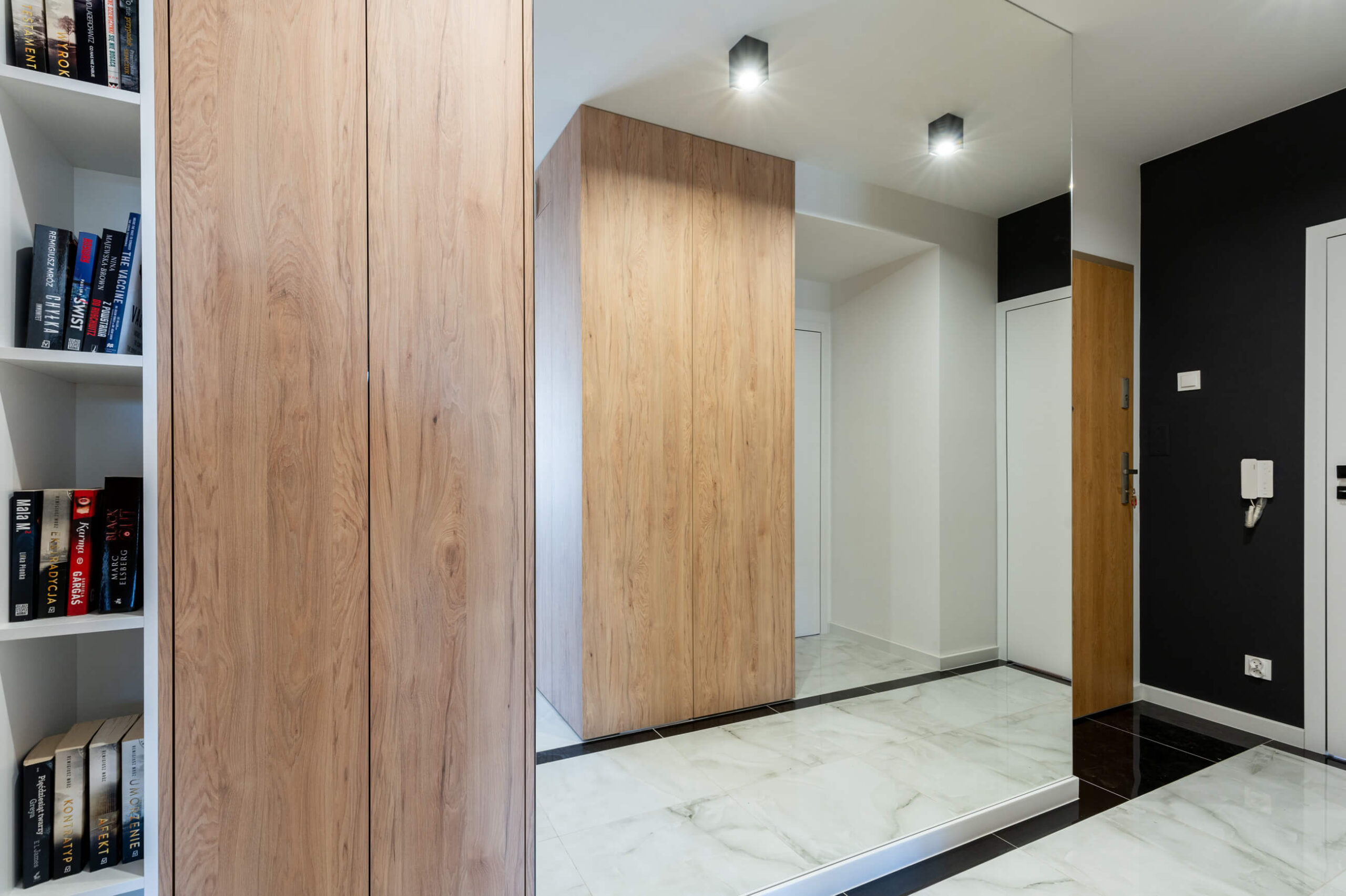 W holu zastosowano praktyczne, wnękowe zabudowy meblowe, które maksymalizują przestrzeń do przechowywania, jednocześnie zachowując regularny kształt i estetyczną spójność wnętrza. Wielkopowierzchniowe lustro odbija światło i otwiera przestrzeń.