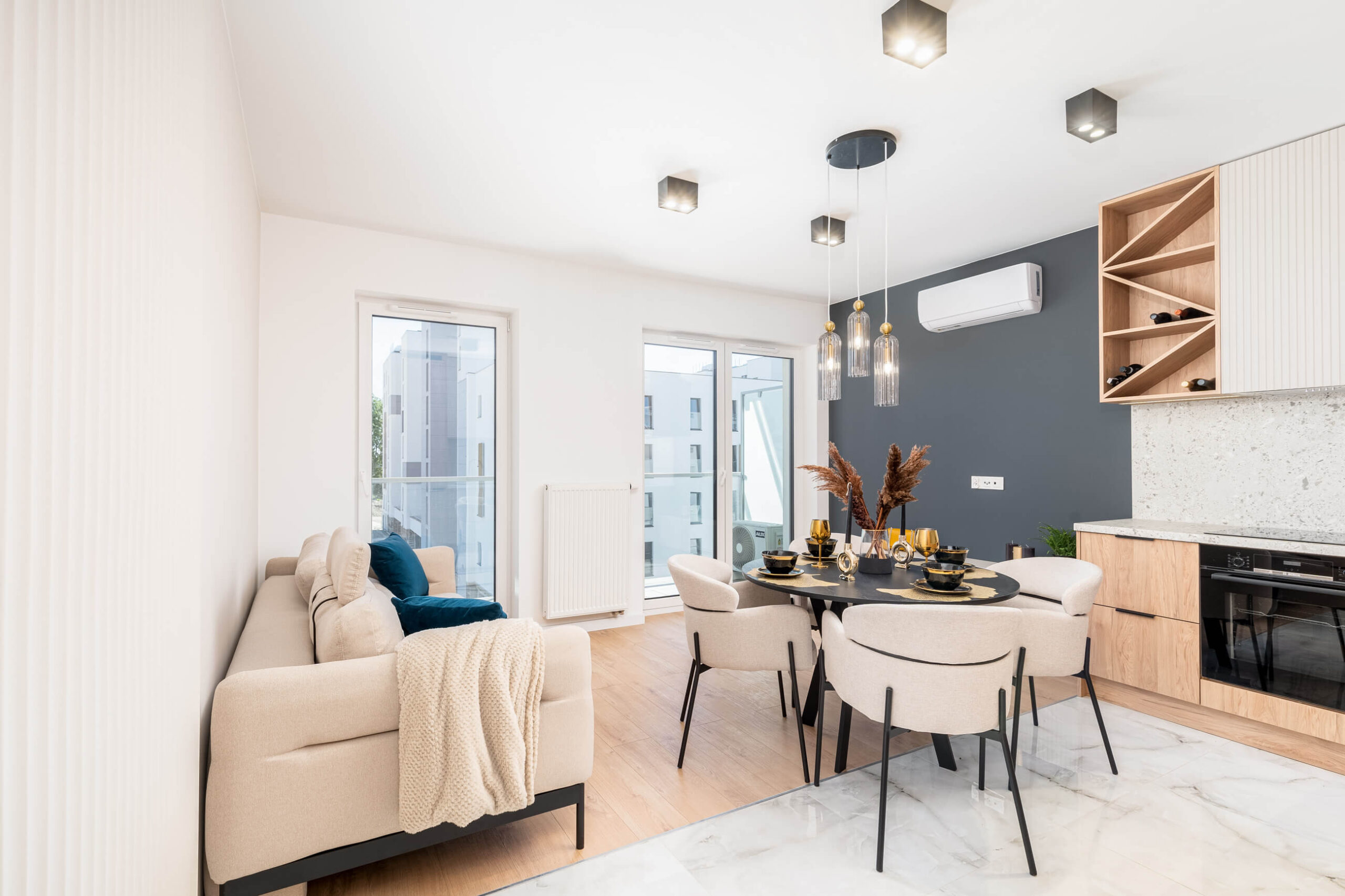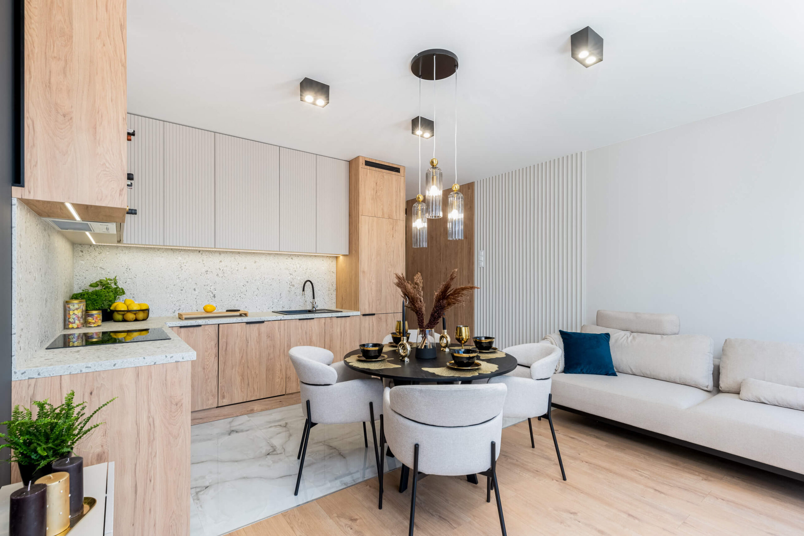 Część dzienna to otwarty, ergonomiczny plan, w którym salon płynnie łączy się z aneksem kuchennym i jadalnią. W salonie znajduje się trzyosobowa sofa oraz dekoracyjna ścianka z trójwymiarowymi panelami, które tworzą ciekawą grę światła i cienia, nadając wnętrzu głębi i charakteru. Z salonu prowadzi wyjście na duży balkon od strony wschodniej – idealne miejsce na poranną kawę. Jadalnia, centralnie usytuowana w strefie dziennej, mieści okrągły stół dla całej rodziny i znajduje się tuż przy kuchni – co czyni codzienne funkcjonowanie niezwykle wygodnym. Przestronny aneks kuchenny został wyposażony w nowoczesne AGD w zabudowie, pojemne szafki, wygodny blat roboczy oraz wnękową szafkę na wino – idealne rozwiązanie dla miłośników dobrego smaku i stylu.