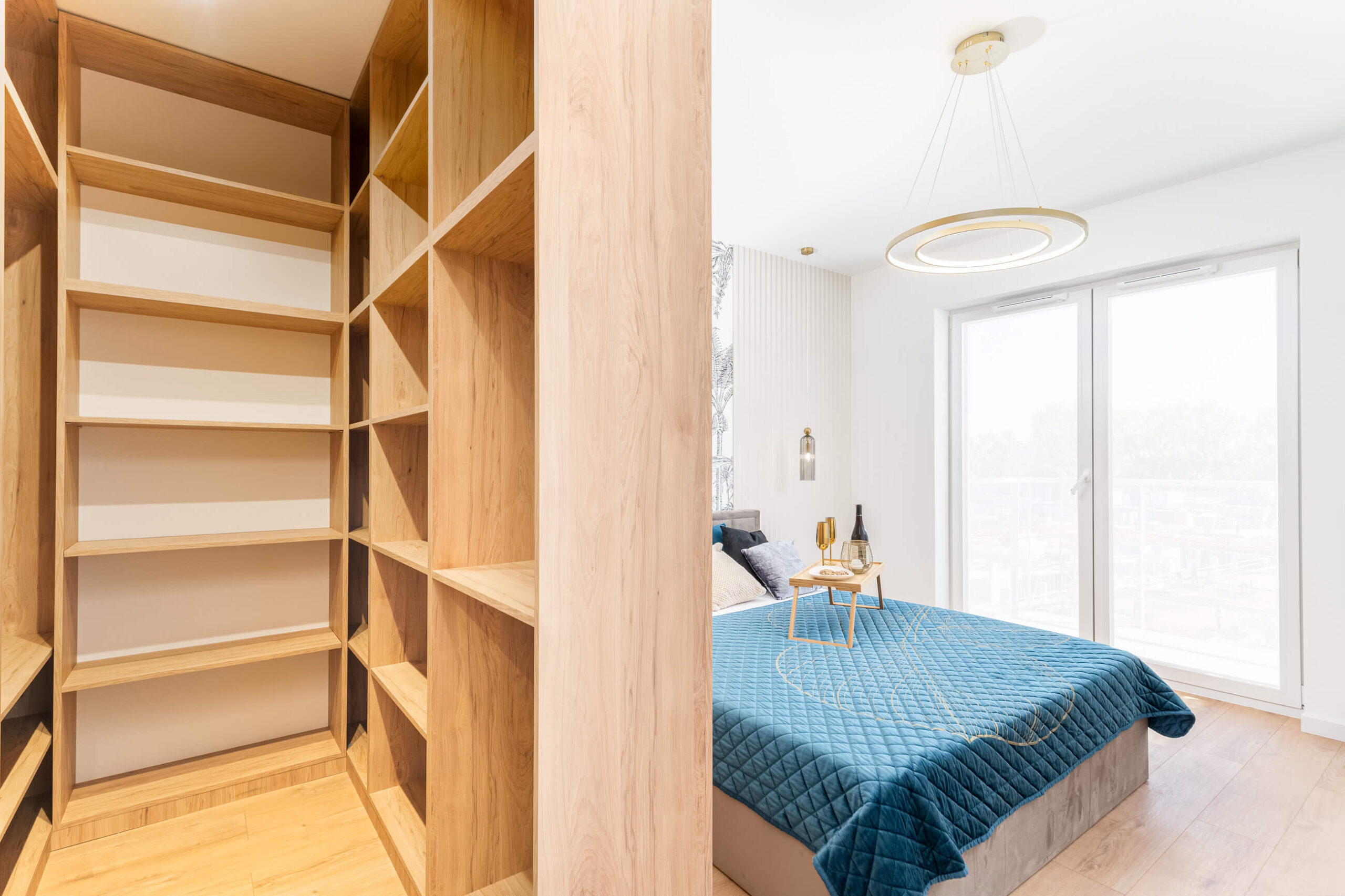 Główna sypialnia to spokojna, funkcjonalna przestrzeń z dużym dwuosobowym łóżkiem, eleganckim biurkiem pełniącym również rolę toaletki, oraz wydzieloną garderobą. Duże ścienne lustro optycznie powiększa przestrzeń, a prywatna łazienka zapewnia intymność i wygodę. Druga sypialnia doskonale sprawdzi się jako pokój dziecięcy lub gabinet – funkcjonalny, dobrze doświetlony i z dostępem do drugiego balkonu.