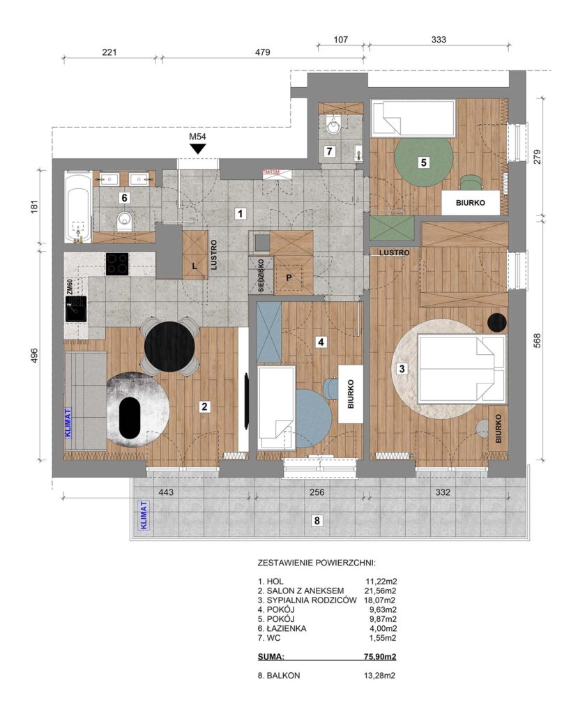 - 75,90 m² + 2 balkony (6,00 m² i 3,60 m²), 3. piętro.