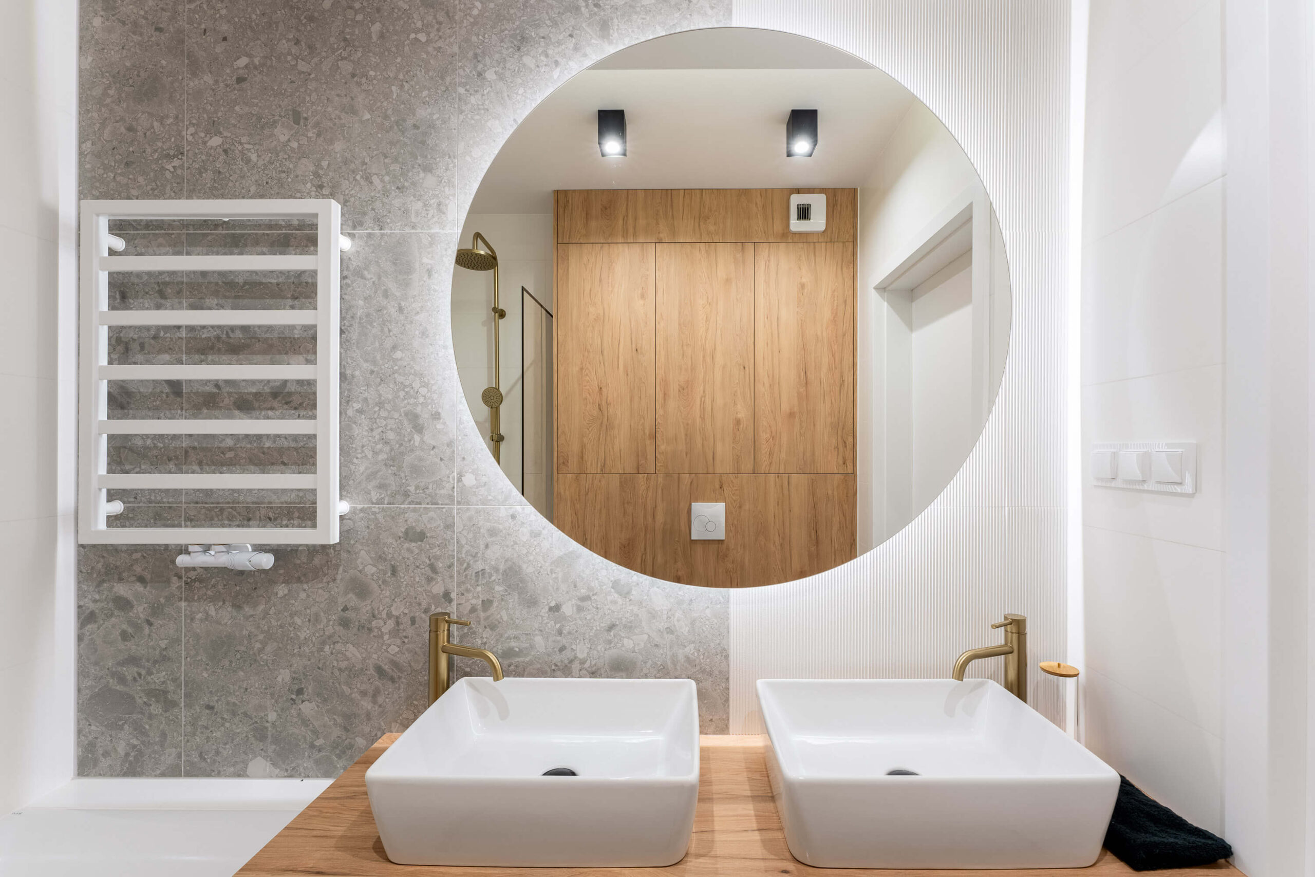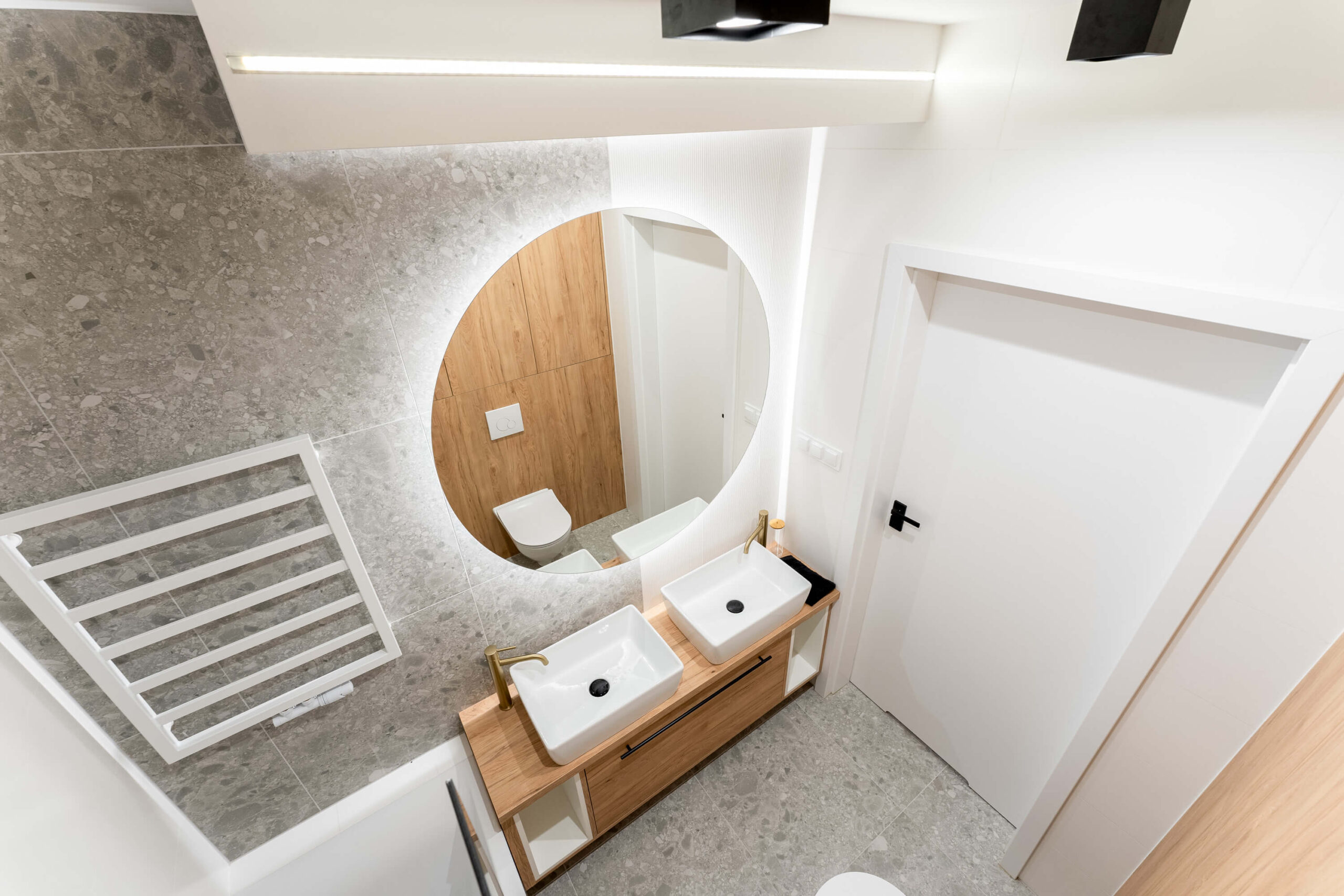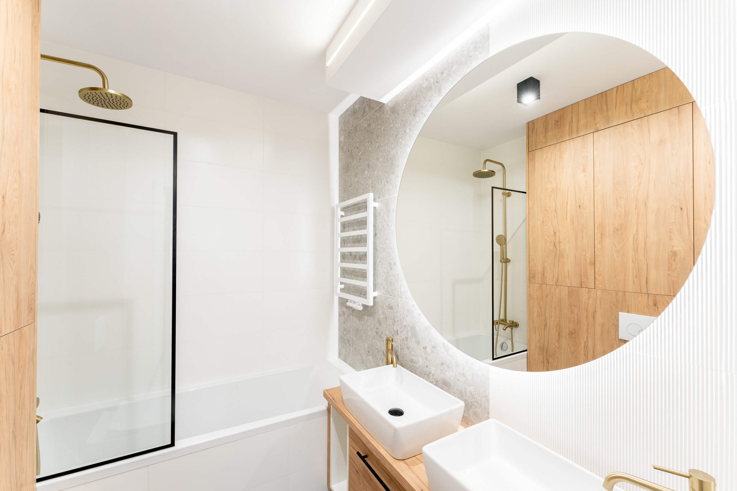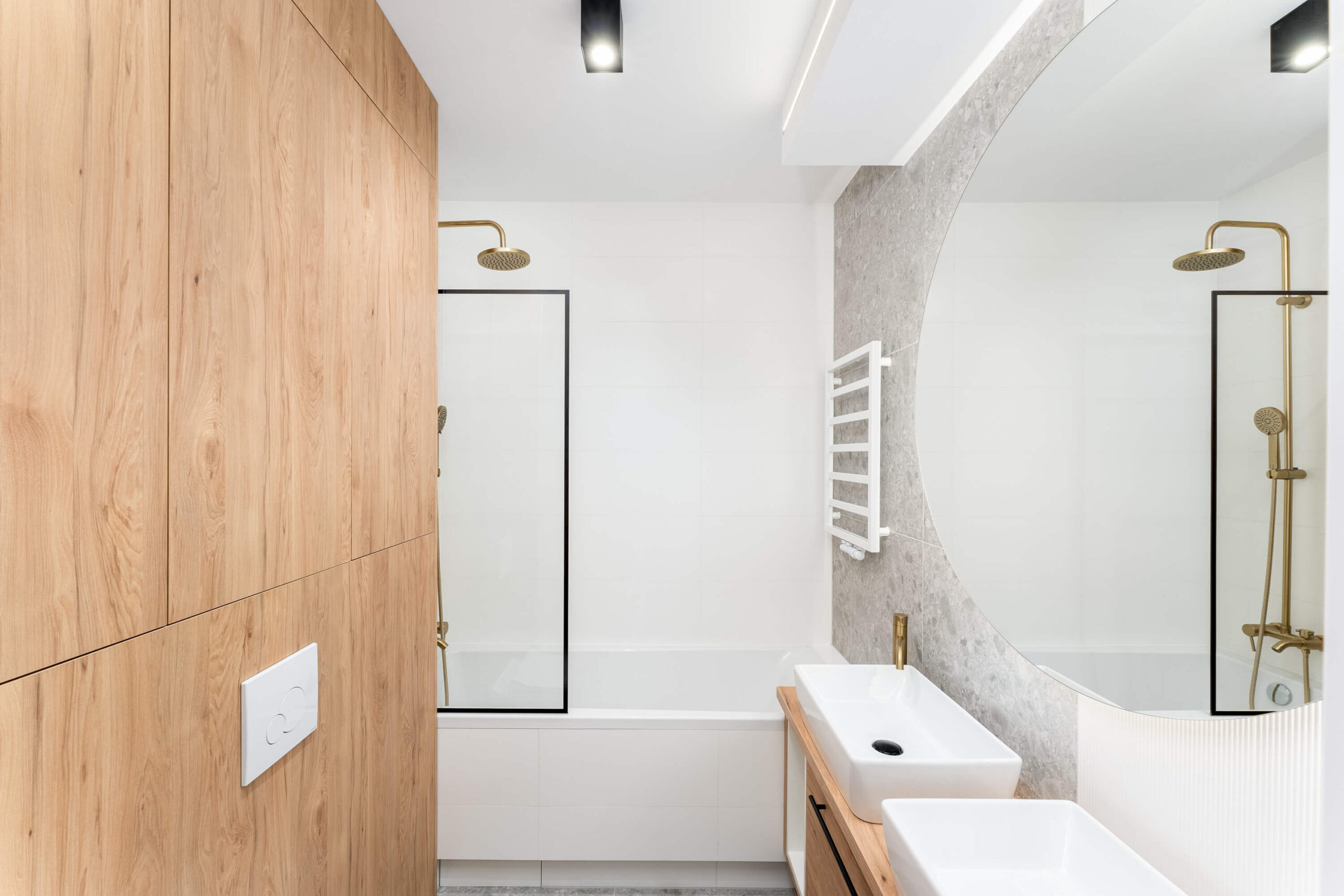 Łazienka główna została zaprojektowana z myślą o komforcie – znajduje się tu duża wanna z funkcją prysznica i deszczownicą, zabezpieczona eleganckim parawanem. Dwie nowoczesne umywalki z pojemną szafką, duże geometryczne lustro z podświetleniem LED oraz starannie dobrana ceramika i armatura tworzą przestrzeń estetyczną i funkcjonalną. Dodatkowym udogodnieniem jest oddzielne WC, co zwiększa komfort codziennego użytkowania.