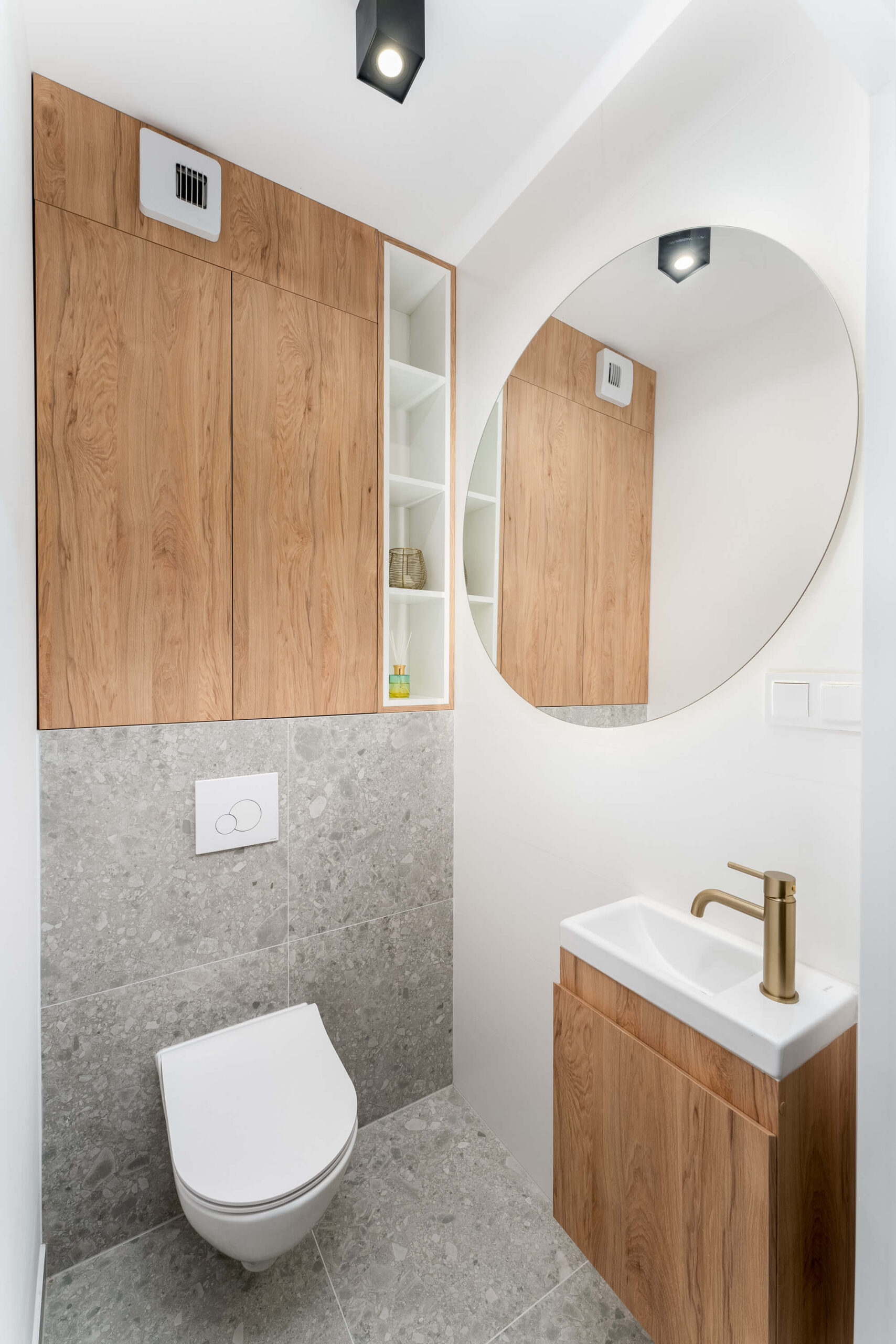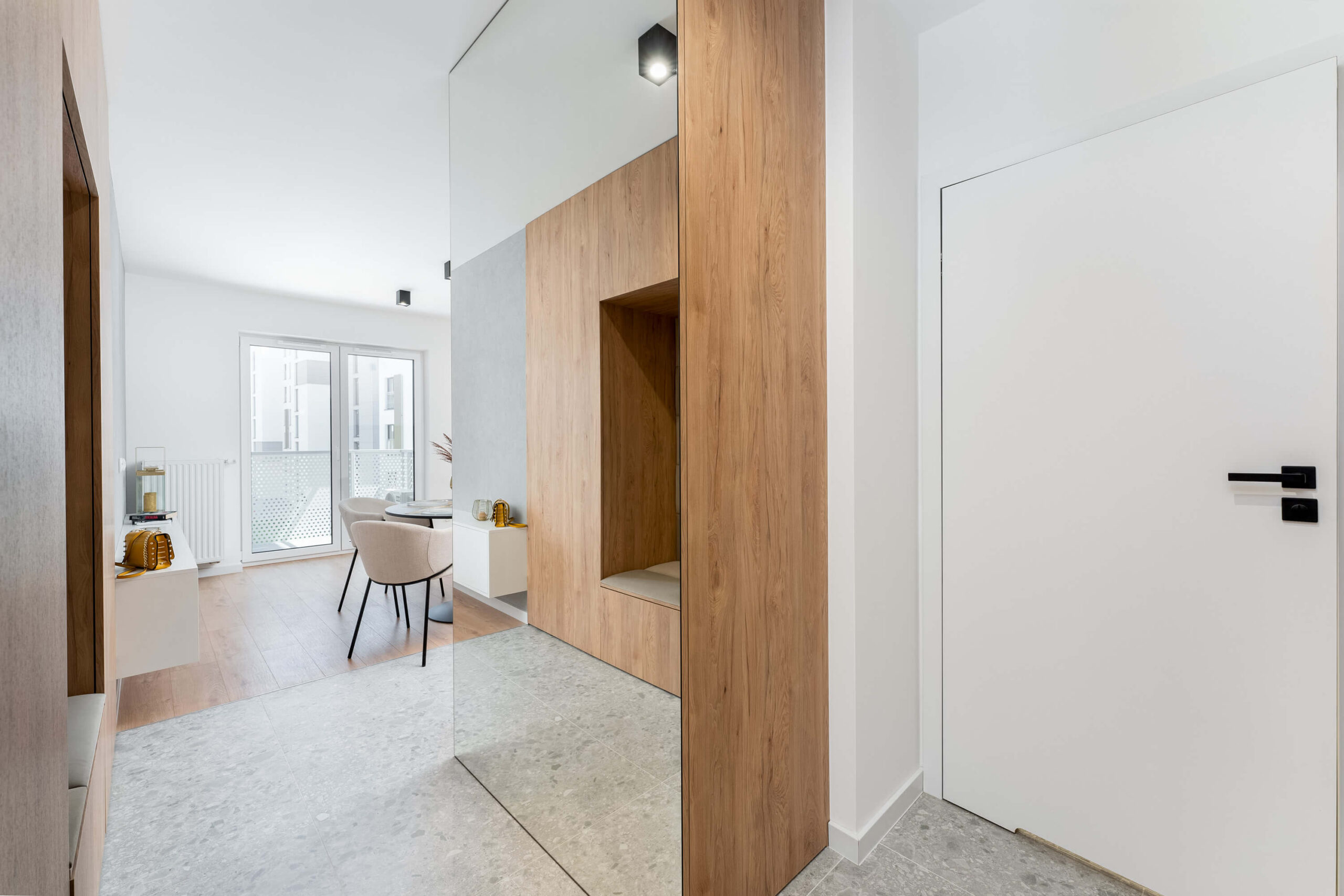Mieszkanie zostało zaprojektowane w stylu nowoczesnym z elementami loftowymi – dominują tu białe powierzchnie, jasne drewno, płytki o kamiennym wykończeniu, architektoniczny beton oraz wyraziste czarne dodatki, które nadają całości charakteru i elegancji. Styl ten łączy w sobie prostotę, funkcjonalność i wysmakowaną estetykę – idealnie odpowiadając na potrzeby współczesnego stylu życia.