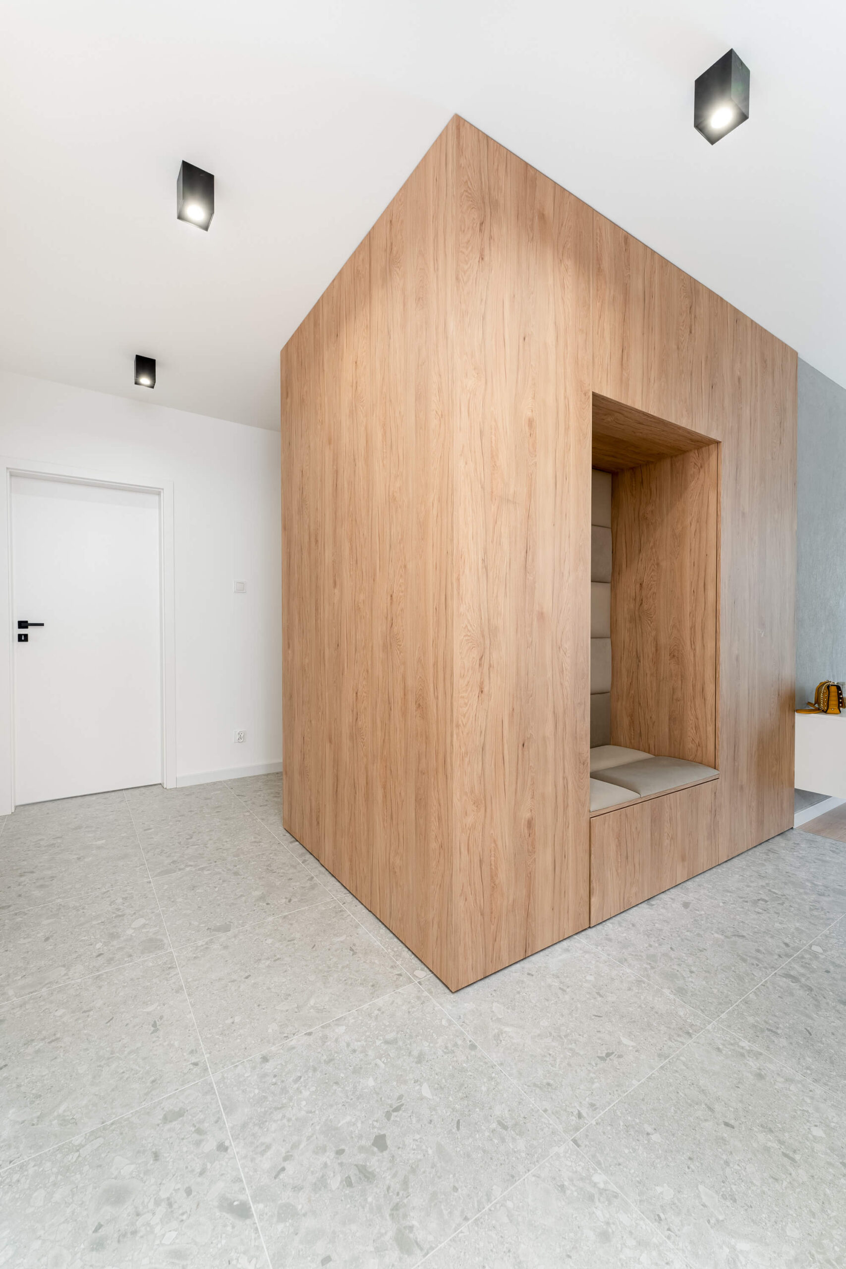 W holu znajduje się pojemna szafa z miejscem na pralkę i sprzęty domowe, a także odzież wierzchnią. Dekoracyjna ściana z lamelami zintegrowana z dużym geometrycznym lustrem i wygodnym siedziskiem czyni tę przestrzeń zarówno estetyczną, jak i funkcjonalną.