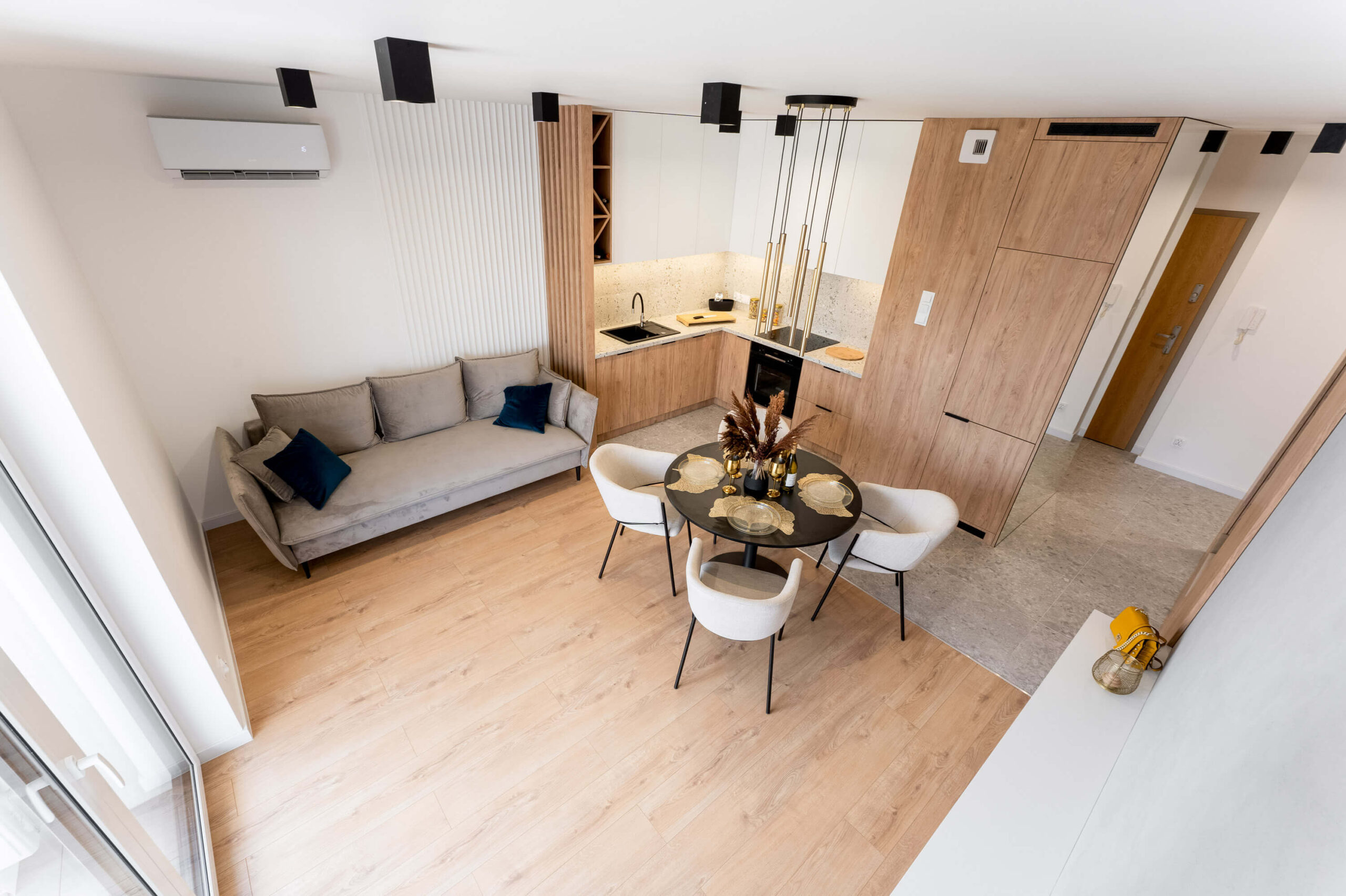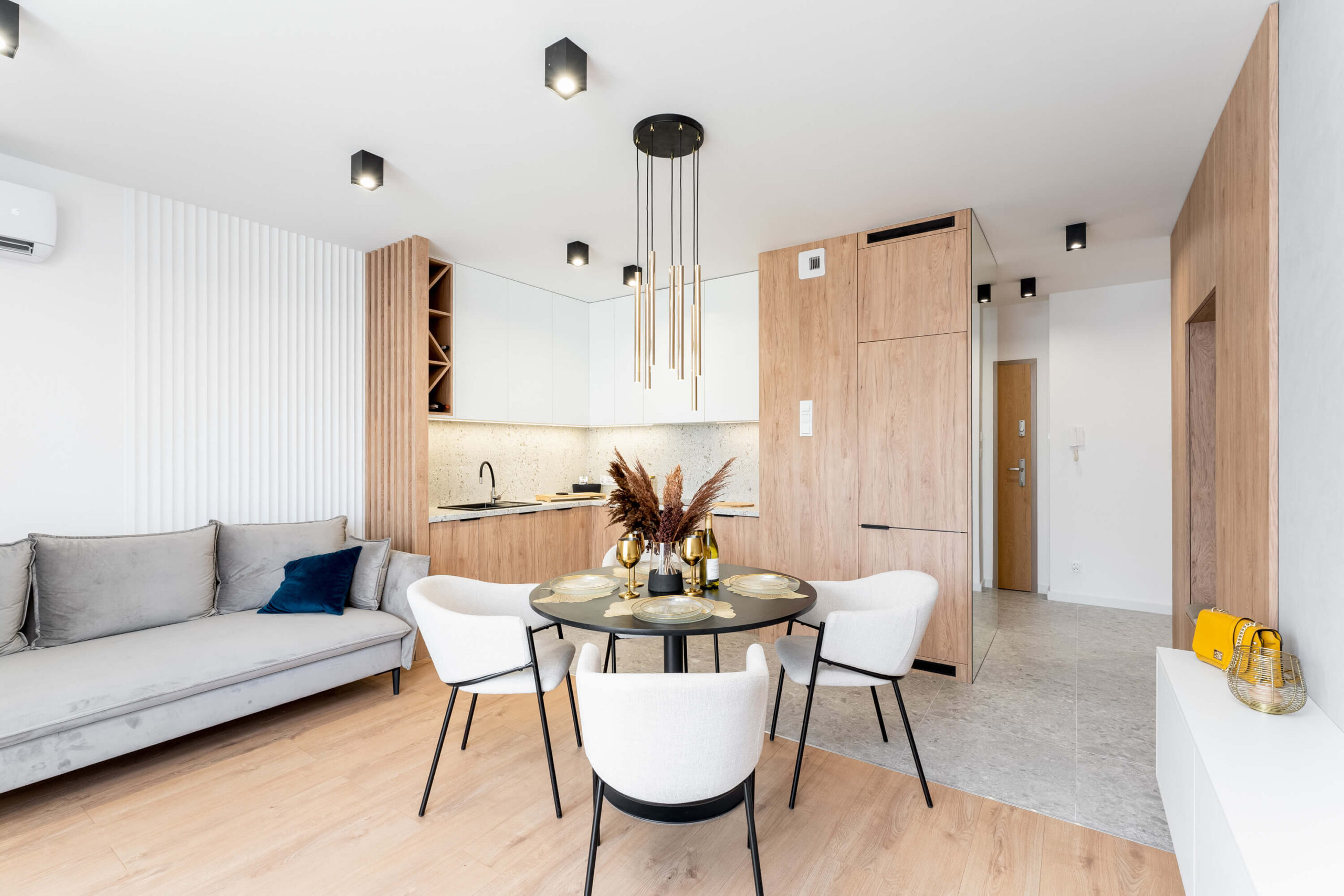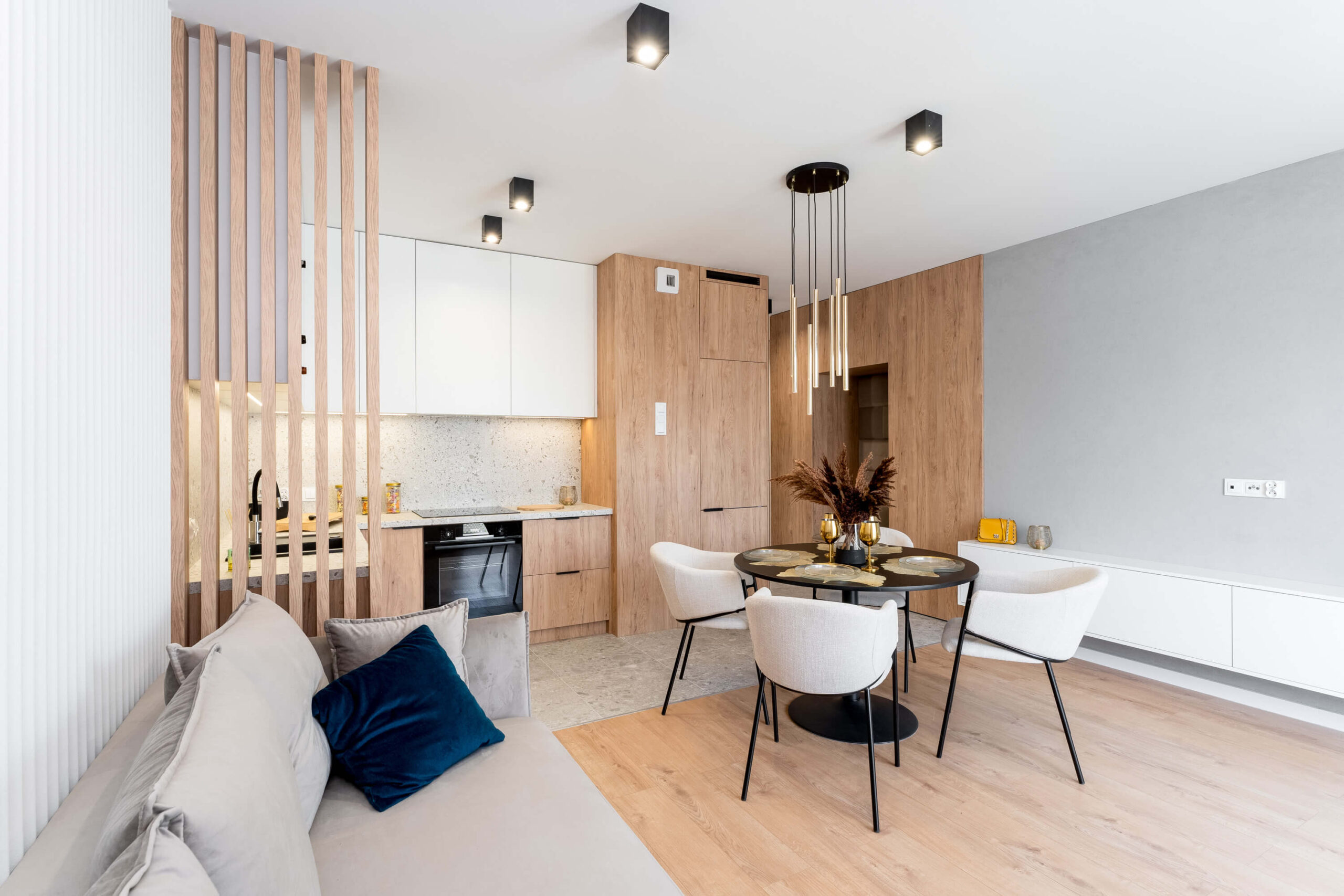 Przestrzeń dzienna zaprojektowana została w formie otwartego planu, który płynnie łączy salon, aneks kuchenny oraz jadalnię. Przestronny salon z trzyosobową sofą stanowi serce mieszkania – uwagę przyciągają tu dekoracyjna ściana z tynkiem strukturalnym oraz ściana z trójwymiarowymi panelami, których faktura subtelnie podkreślana jest przez grę światła i cienia. Duże okna nie tylko optycznie powiększają przestrzeń, ale także doskonale ją doświetlają, a bezpośrednie wyjście na balkon sprawia, że wnętrze zyskuje naturalne przedłużenie w postaci zielonej, prywatnej oazy. Jadalnia, centralnie umiejscowiona między salonem a kuchnią, korzysta z naturalnego światła dziennego i stanowi idealne miejsce do codziennych posiłków i rodzinnych spotkań. Tuż obok znajduje się nowoczesny, funkcjonalny aneks kuchenny z wygodnym blatem roboczym, pojemnymi szafkami i pełnym wyposażeniem AGD – idealny do gotowania zarówno na co dzień, jak i dla gości.
