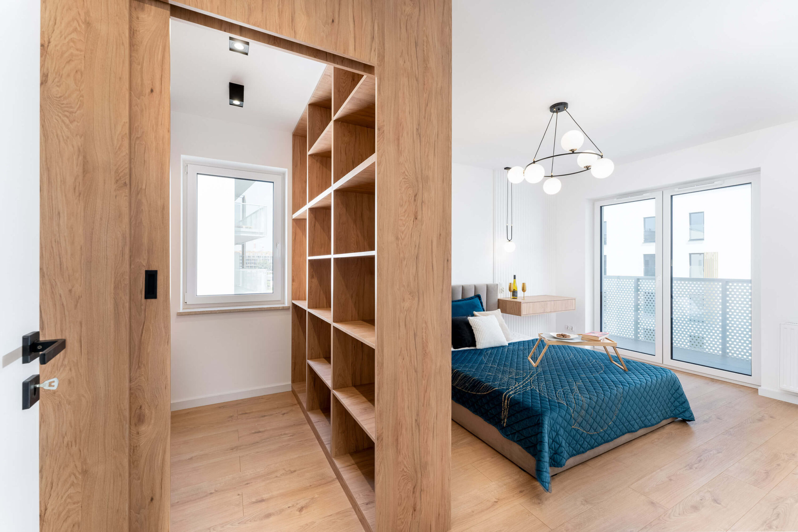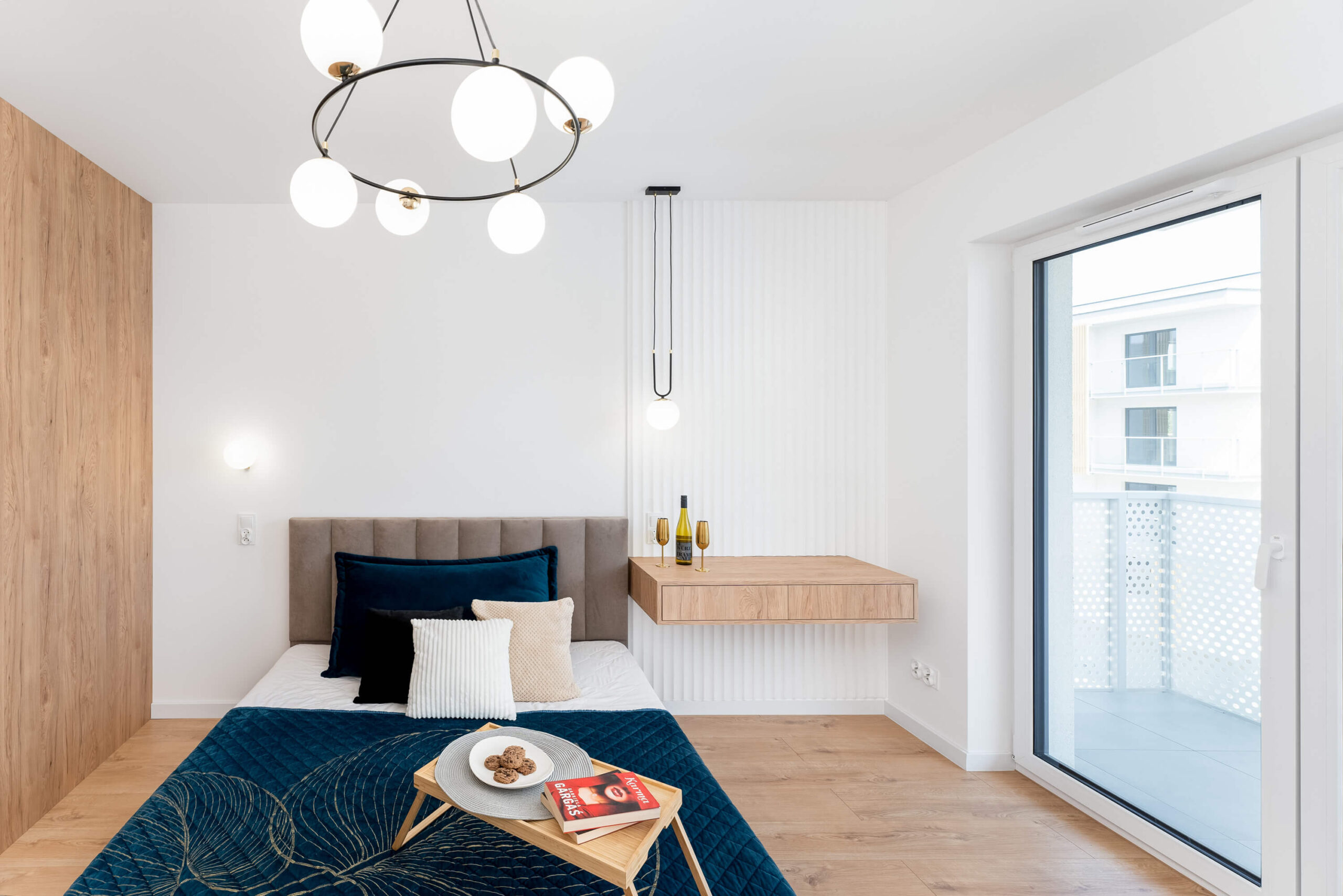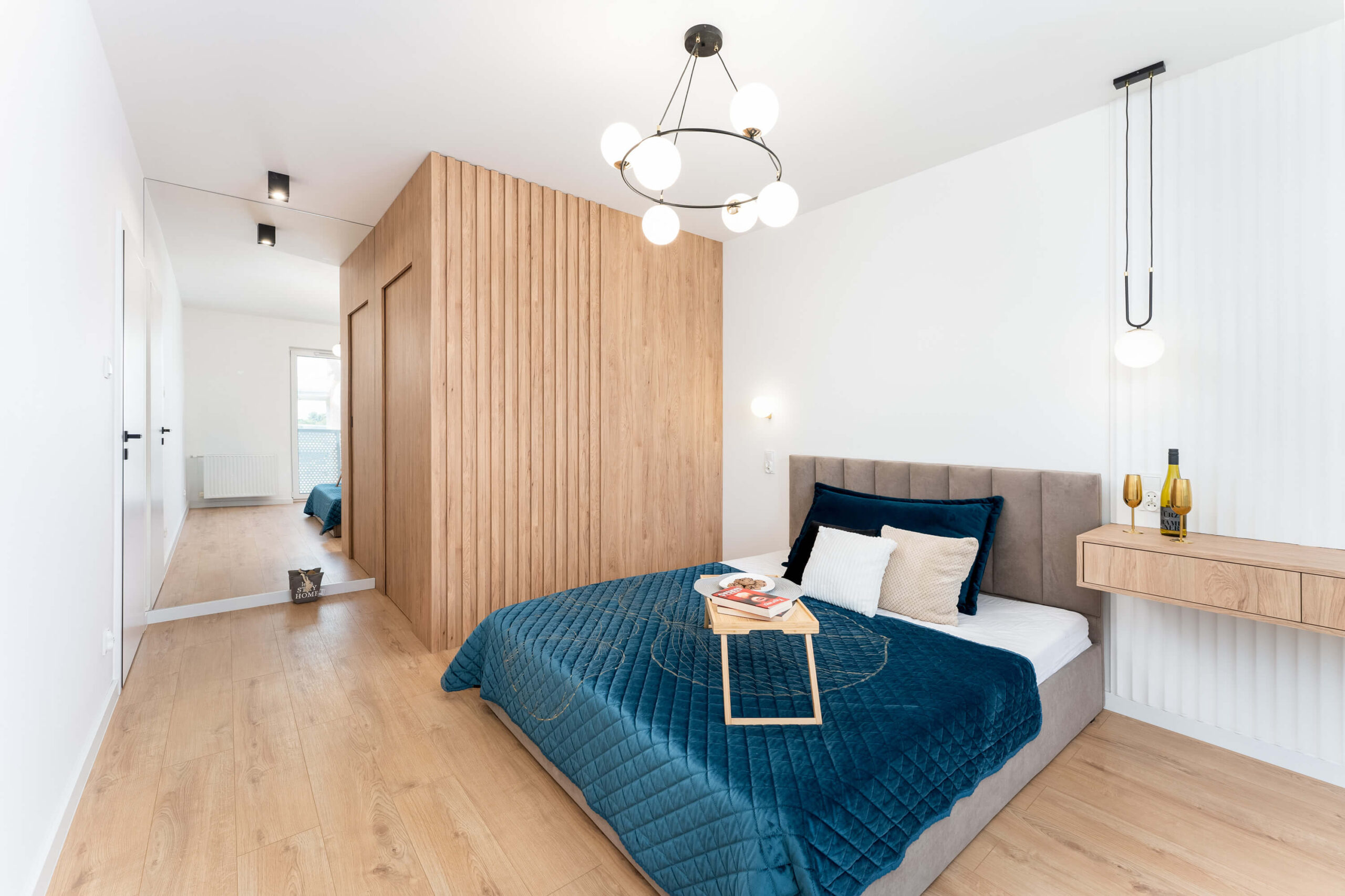 Część prywatna mieszkania składa się z trzech pokoi, które można dowolnie aranżować jako sypialnie, pokoje dziecięce lub gabinet do pracy. Główna sypialnia oferuje miejsce na duże, dwuosobowe łóżko, prywatną garderobę oraz zabudowę z biurkiem, które pełni również funkcję toaletki. Duże lustro ścienne optycznie powiększa pomieszczenie i nadaje mu dodatkowej lekkości.