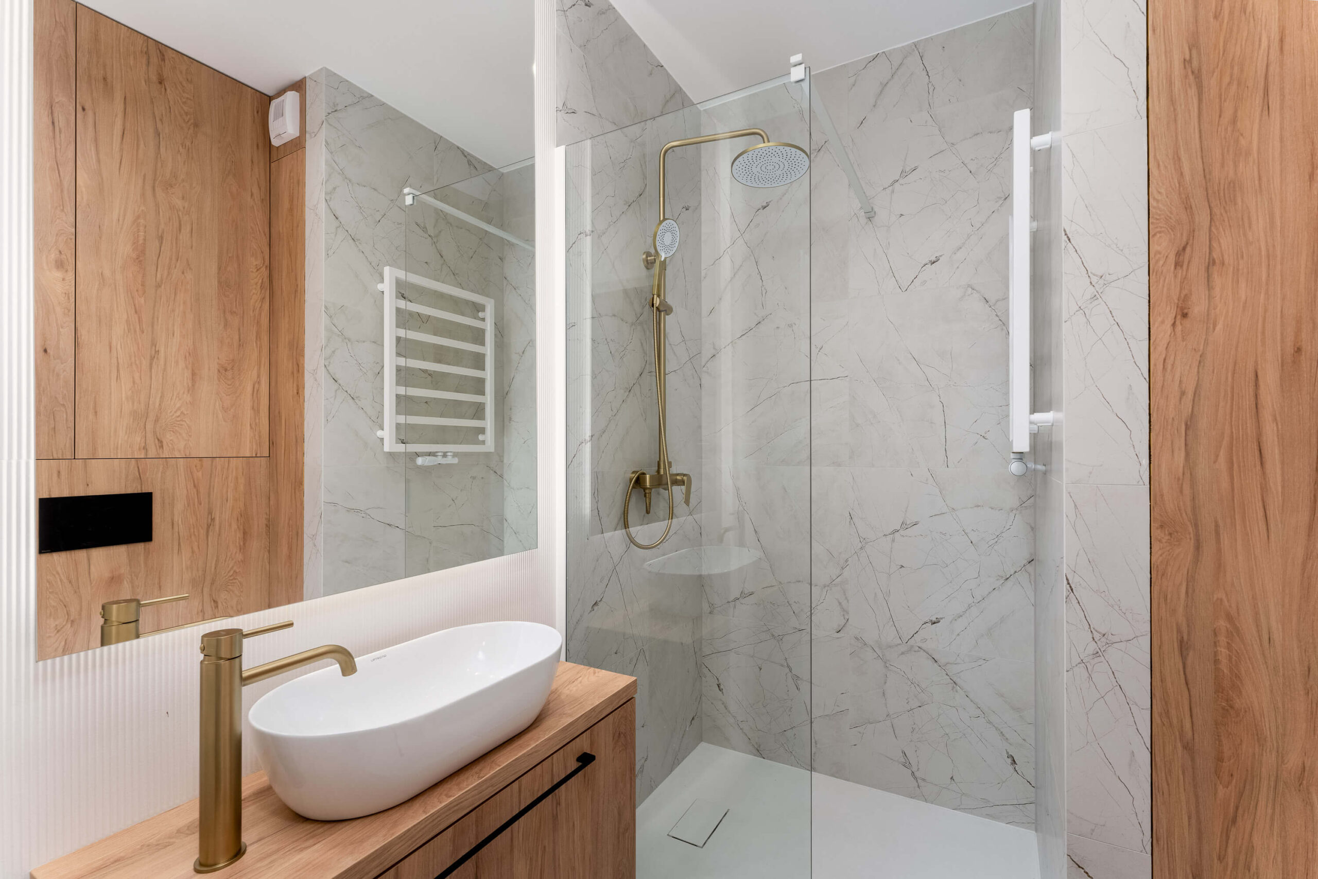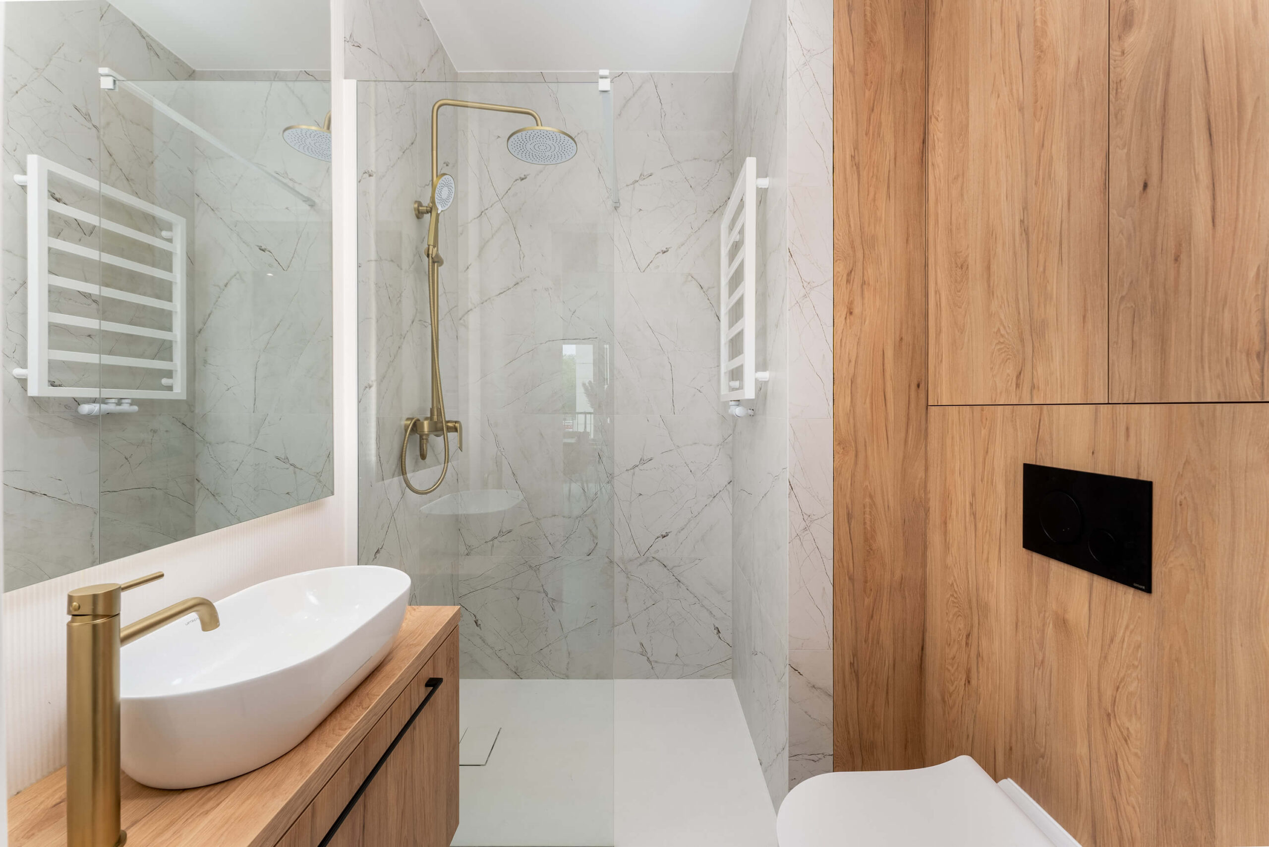 Apartament posiada elegancką łazienkę z wanną z funkcją prysznica, deszczownicą i szklanym parawanem oraz dodatkową toaletę z kabiną prysznicową. Obie przestrzenie zostały wykończone z zastosowaniem nowoczesnych rozwiązań i wysokiej klasy materiałów. W holu przewidziano pojemne szafy do przechowywania oraz zabudowę z miejscem na pralkę i suszarkę.
