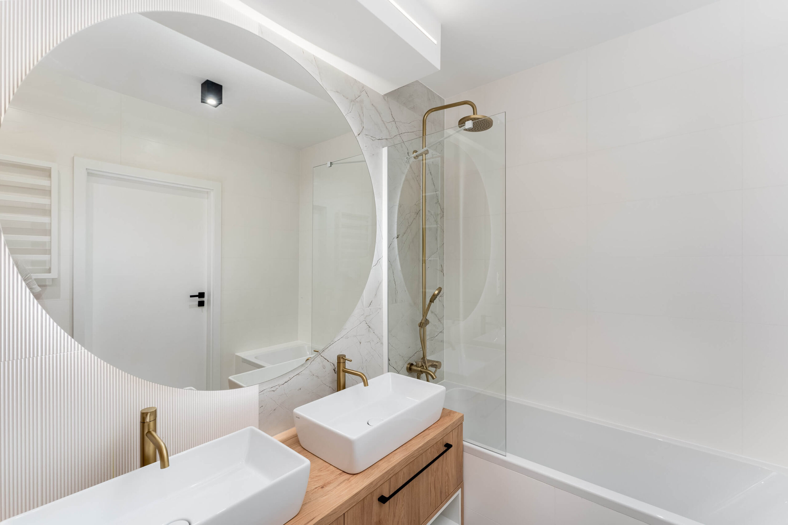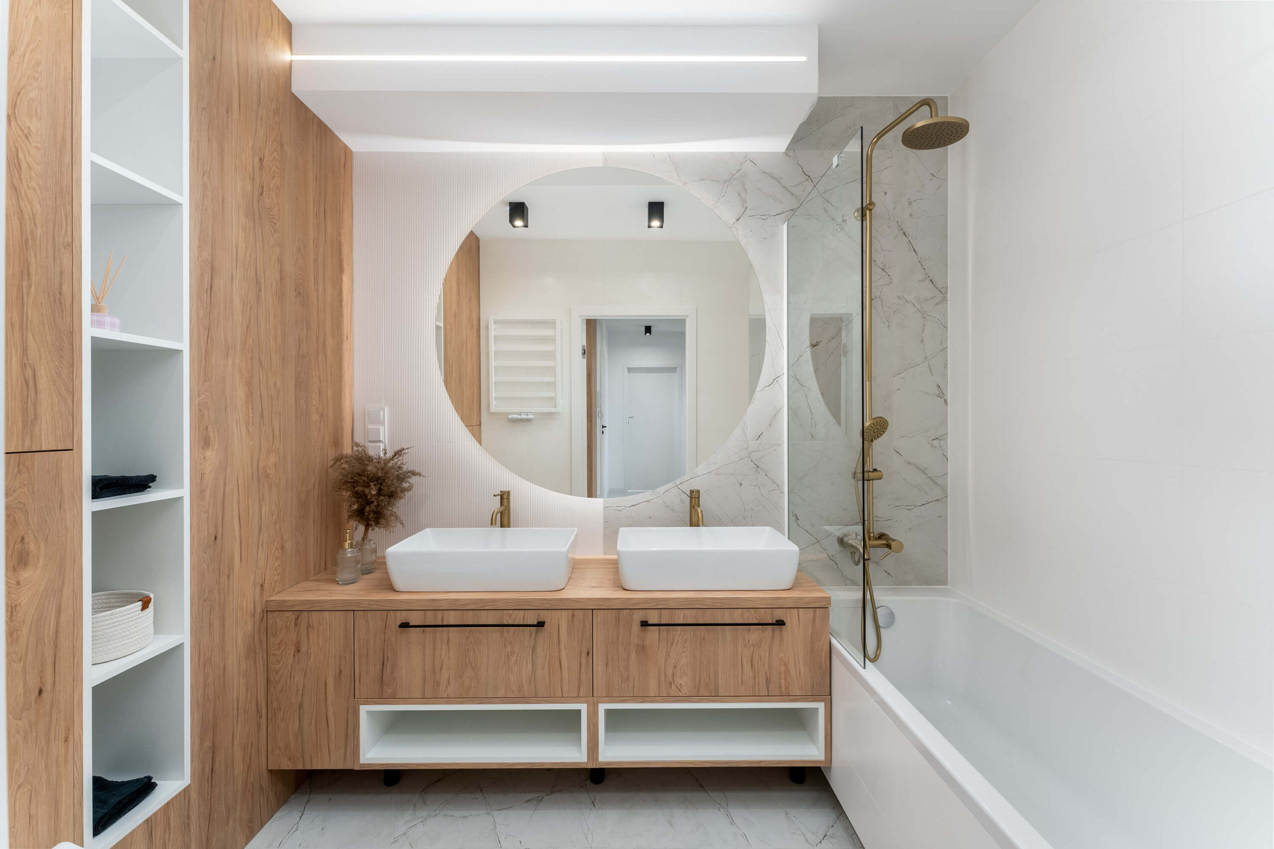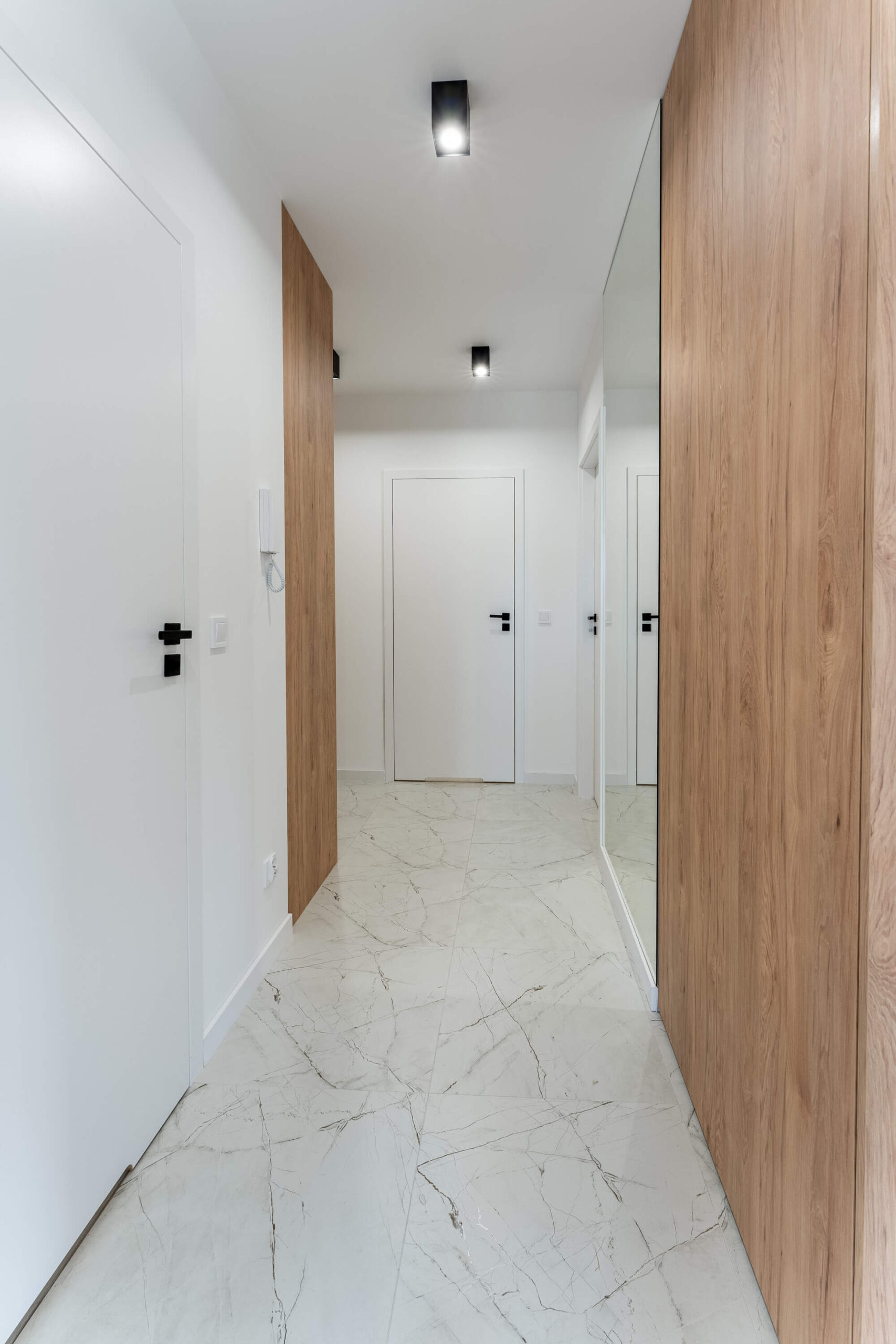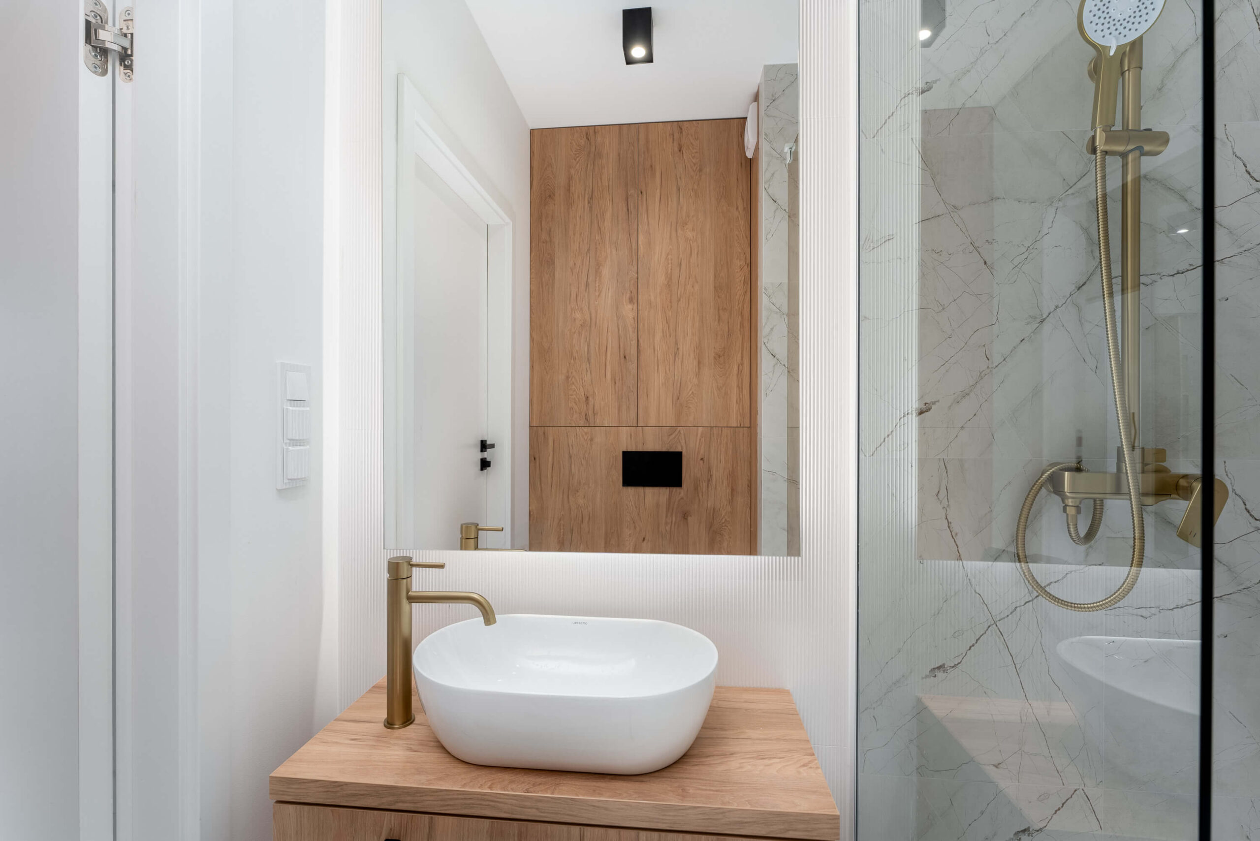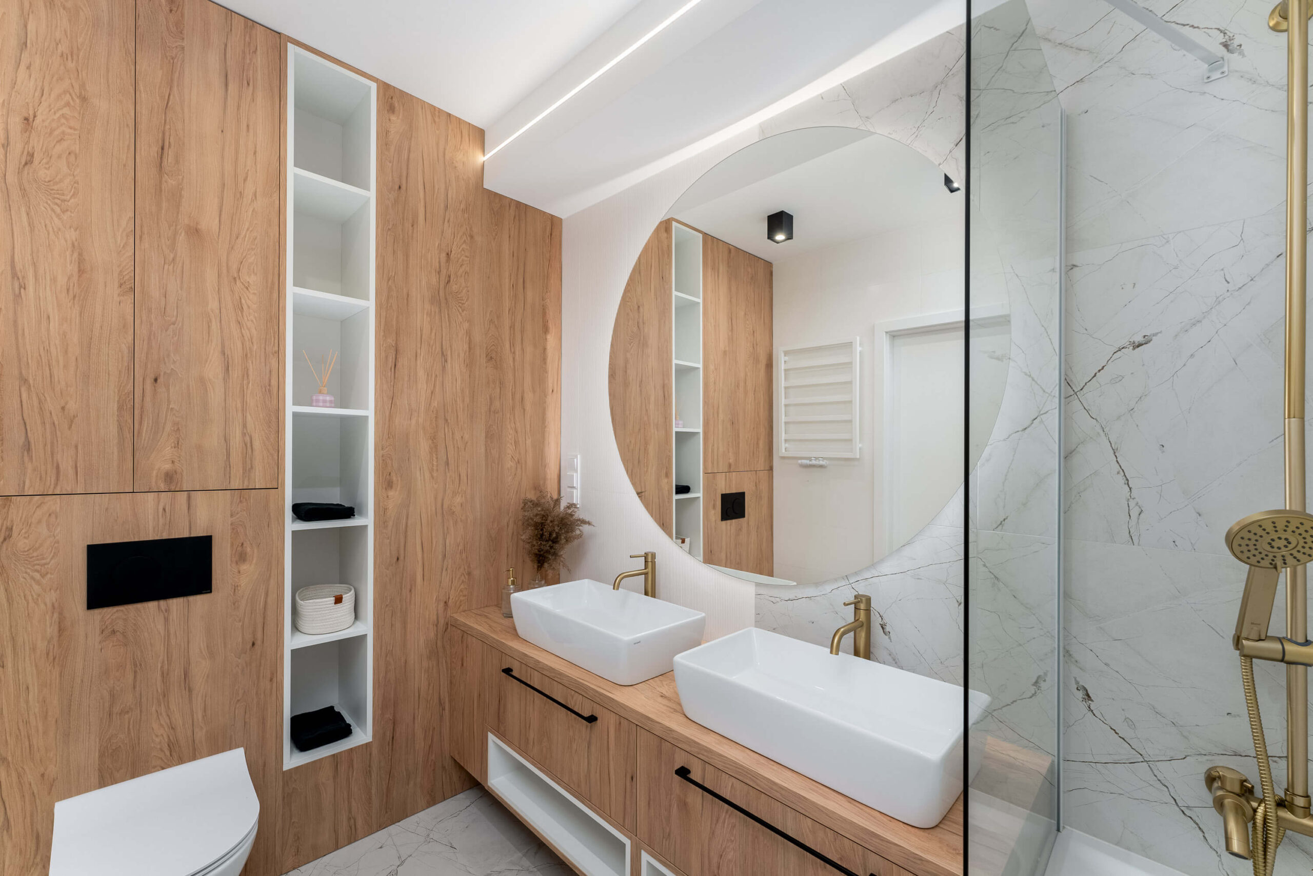 Wnętrze zostało zaprojektowane z dbałością o funkcjonalność i estetykę – dominują tu jasne, naturalne kolory, ciepłe odcienie drewna i kamienia, które zestawiono z białymi powierzchniami i subtelnymi czarnymi akcentami. Różnorodne faktury i materiały nadają przestrzeni głębi, a oryginalne detale oraz duże, podświetlone lustra wprowadzają elegancki charakter.