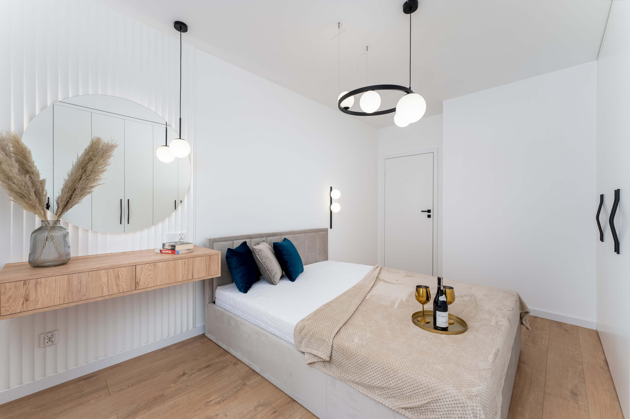 Centrum mieszkania stanowi przestronny salon połączony z aneksem kuchennym i jadalnią – to otwarta, tętniąca światłem przestrzeń idealna do relaksu i wspólnego spędzania czasu. Główna sypialnia została wyposażona w duże, wygodne łóżko, praktyczną toaletkę z lustrem LED oraz pojemną szafę pełniącą funkcję garderoby. Drugi pokój może z powodzeniem służyć jako sypialnia dziecka, pokój gościnny lub funkcjonalne domowe biuro.
