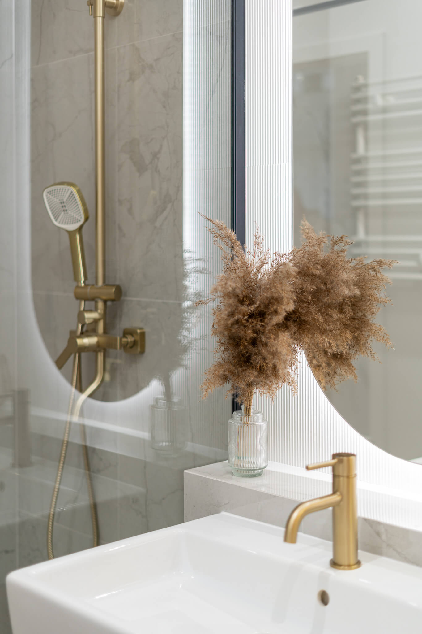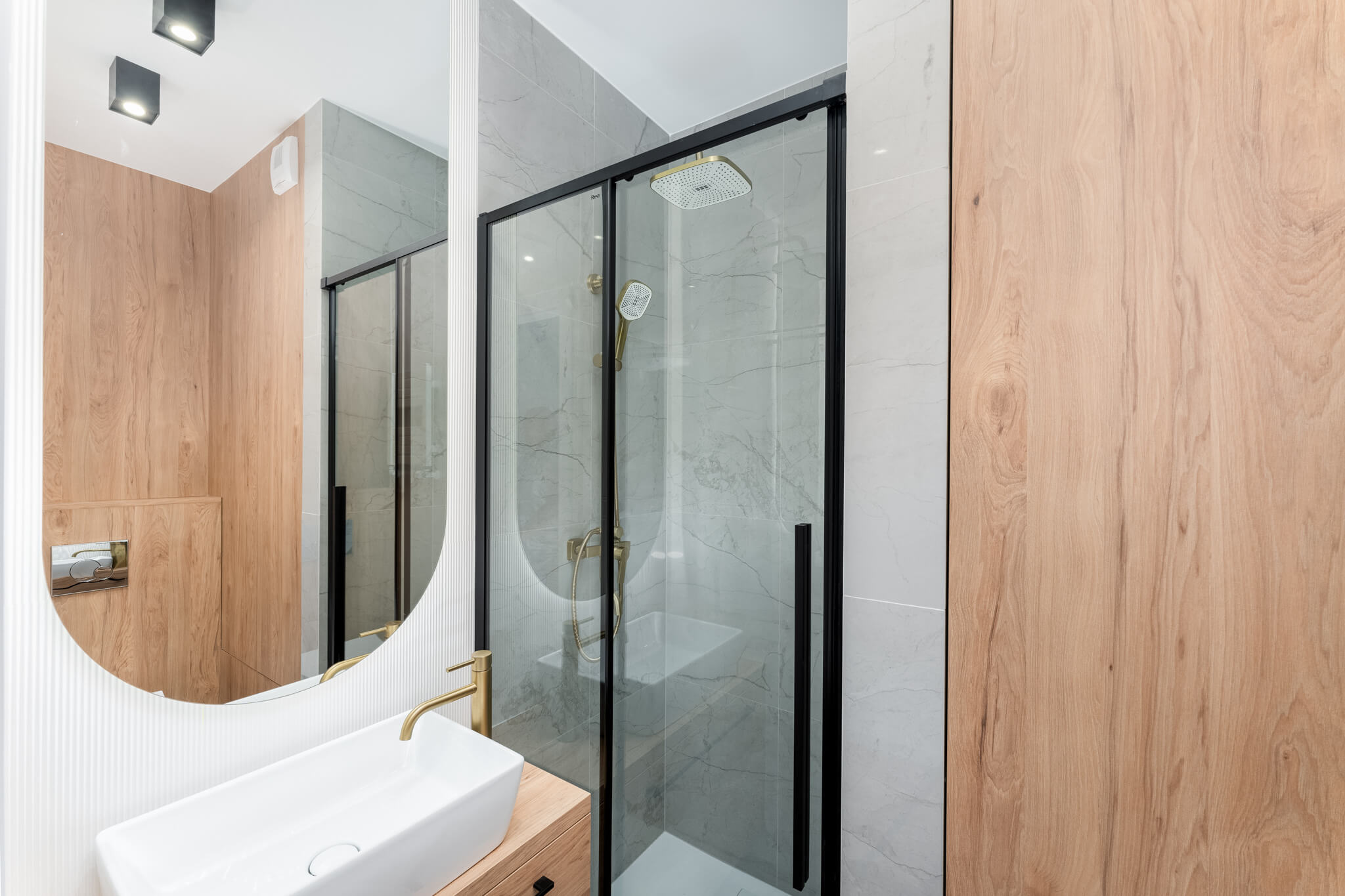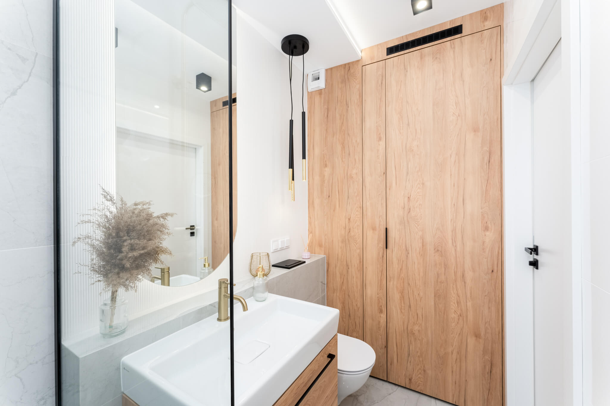 Główna łazienka wyposażona została w przestronny prysznic z deszczownicą, osłoniętą szklanym parawanem, oraz praktyczną zabudowę z miejscem na pralkę. Dodatkowe szafy w holu oraz wygodne siedzisko zapewniają porządek i codzienny komfort.