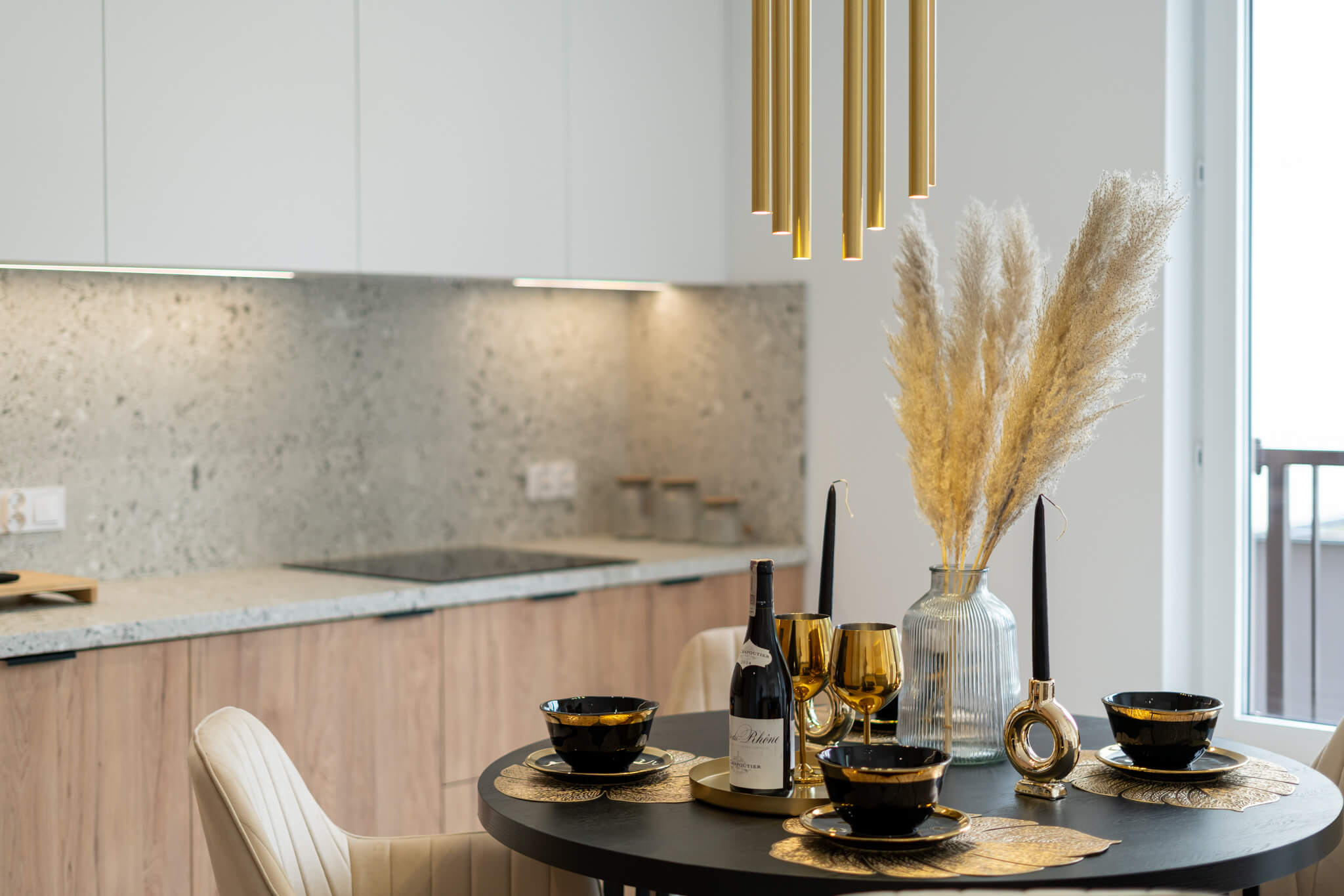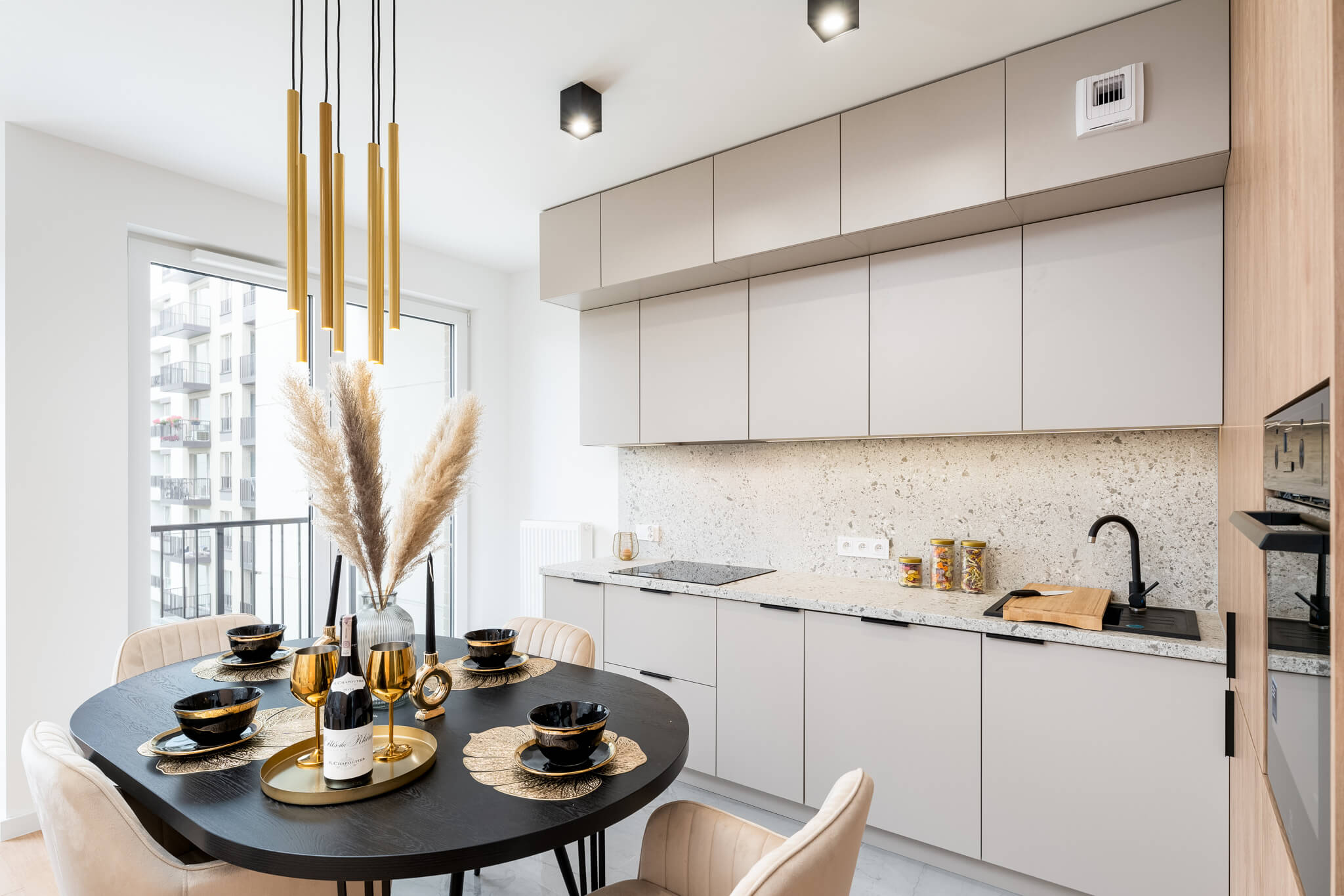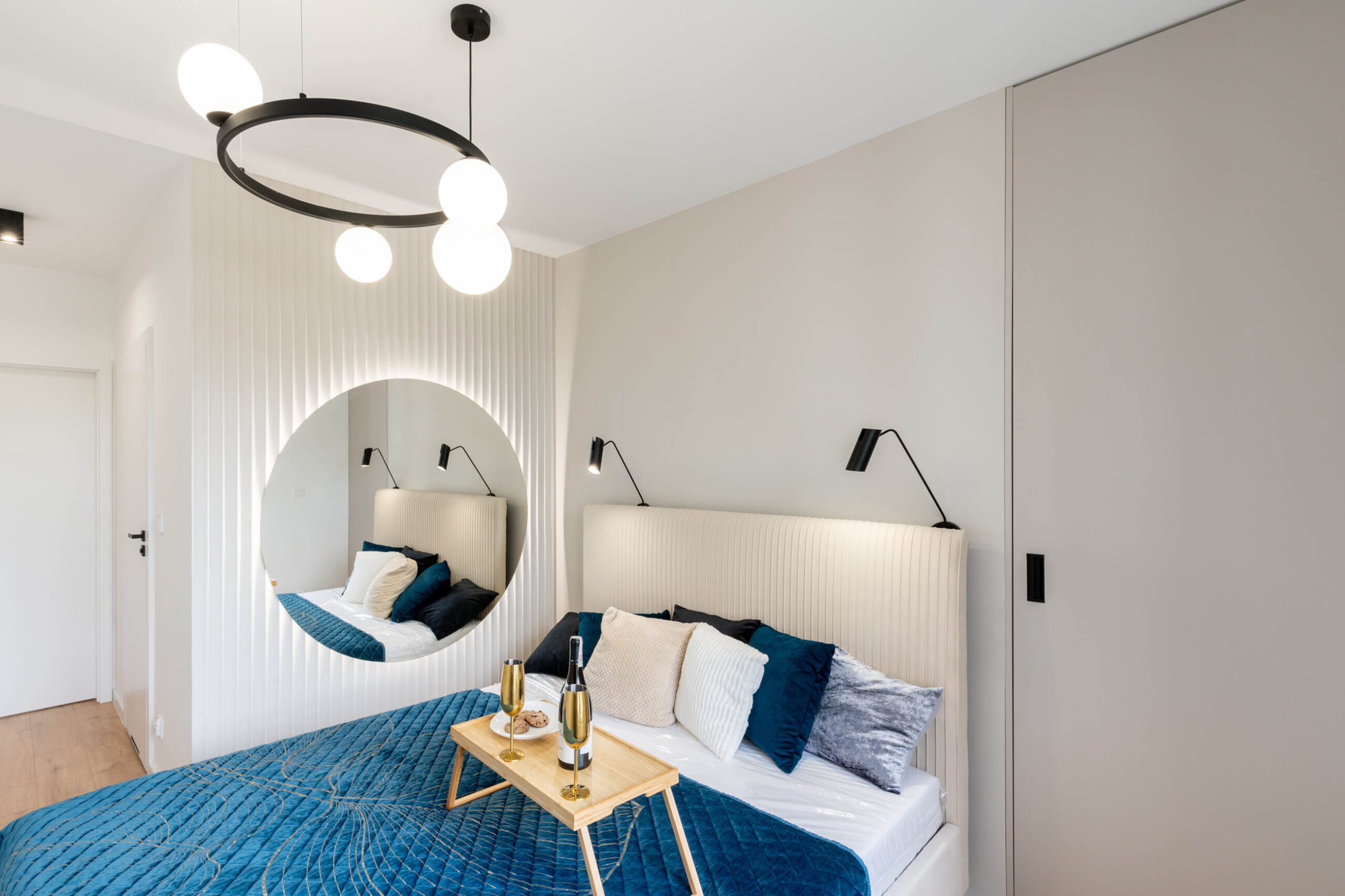 Wnętrze zaprojektowane zostało w duchu stylu japandi, który harmonijnie łączy minimalizm japoński z przytulnością skandynawskiego designu. Dominują tu jasne, naturalne barwy, subtelne odcienie drewna i kamienia, które przeplatają się z eleganckimi kaszmirowymi meblami i czarnymi, kontrastującymi akcentami. Przemyślane zestawienie tekstur i materiałów – od gładkich powierzchni po matowe fronty, od naturalnych tkanin po lśniące lustra – nadaje mieszkaniu charakteru i wyrafinowania.