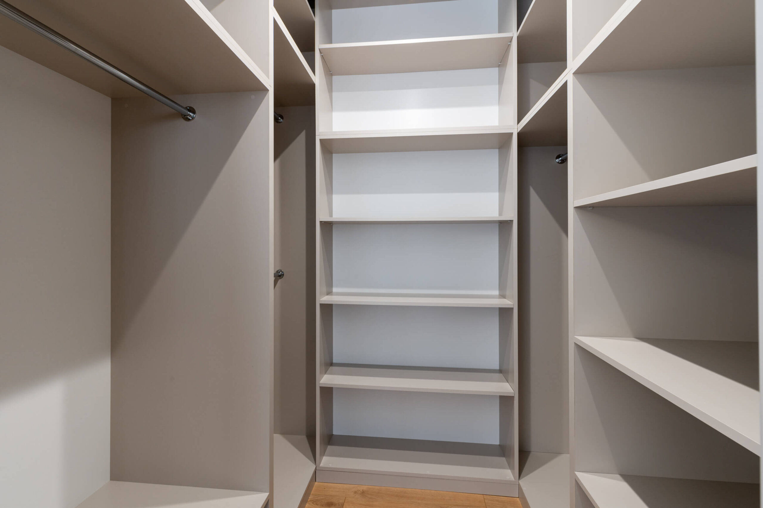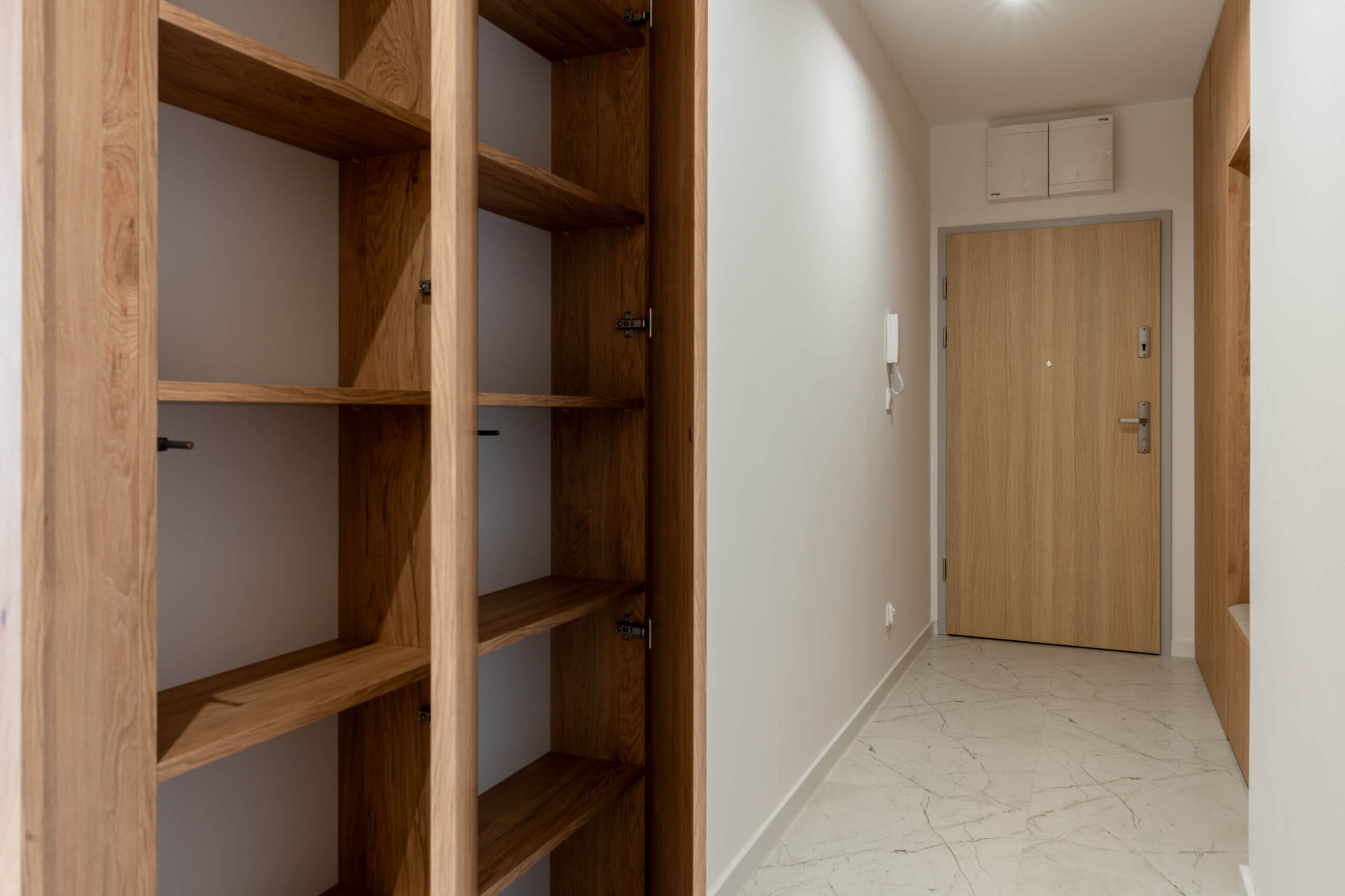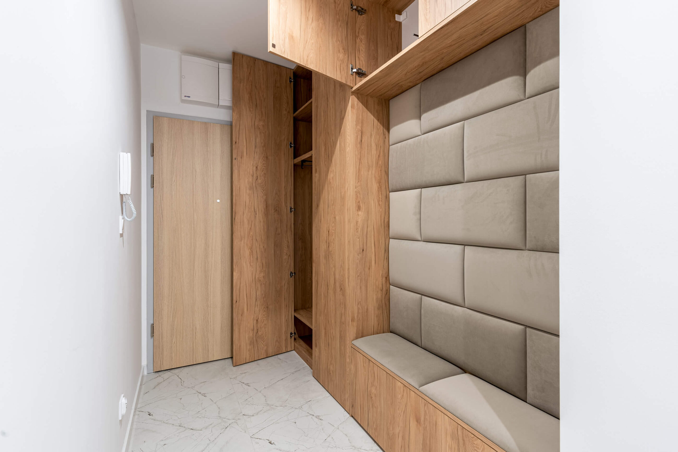 Wnętrze zaprojektowane zostało w duchu stylu japandi, który harmonijnie łączy minimalizm japoński z przytulnością skandynawskiego designu. Dominują tu jasne, naturalne barwy, subtelne odcienie drewna i kamienia, które przeplatają się z eleganckimi kaszmirowymi meblami i czarnymi, kontrastującymi akcentami. Przemyślane zestawienie tekstur i materiałów – od gładkich powierzchni po matowe fronty, od naturalnych tkanin po lśniące lustra – nadaje mieszkaniu charakteru i wyrafinowania.